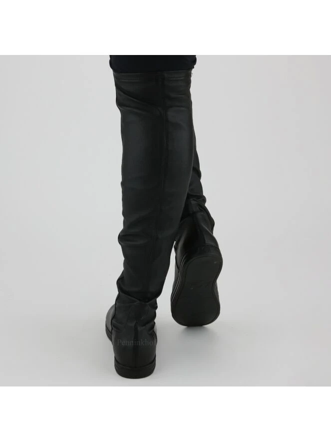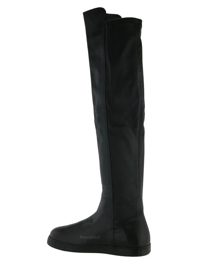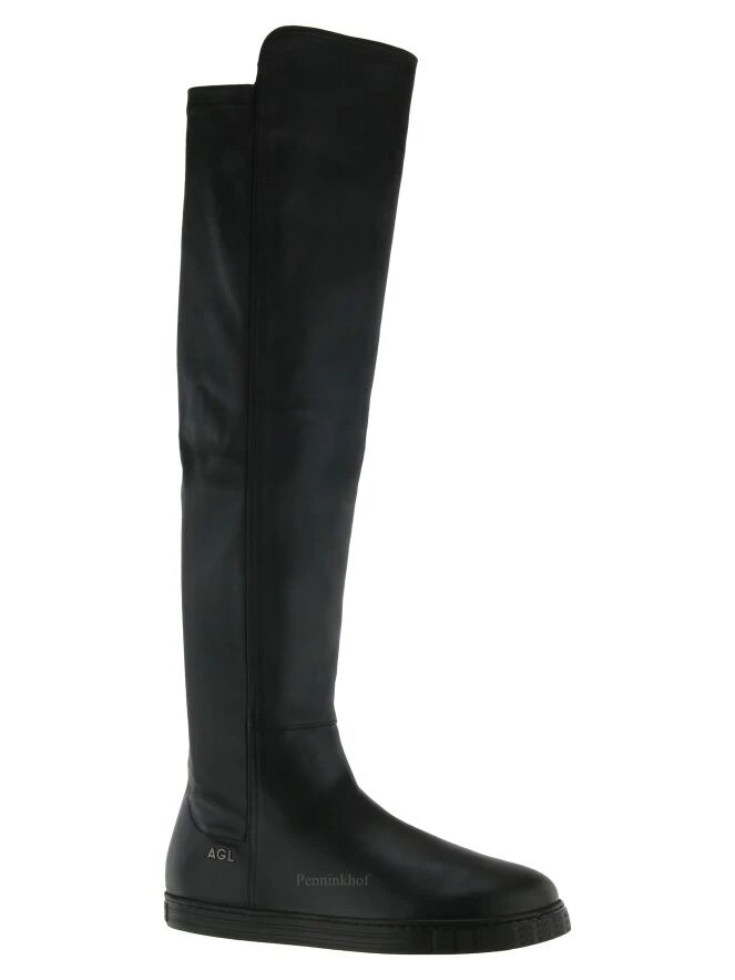 Ein schwarzer Stretch-Overkneestiefel der Designerschuhmarke AGL. Die Vorderseite des Schafts ist aus weichem Nappaleder, die Rückseite aus Stretch-Lederimitat.