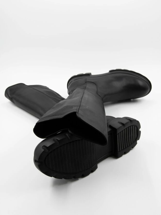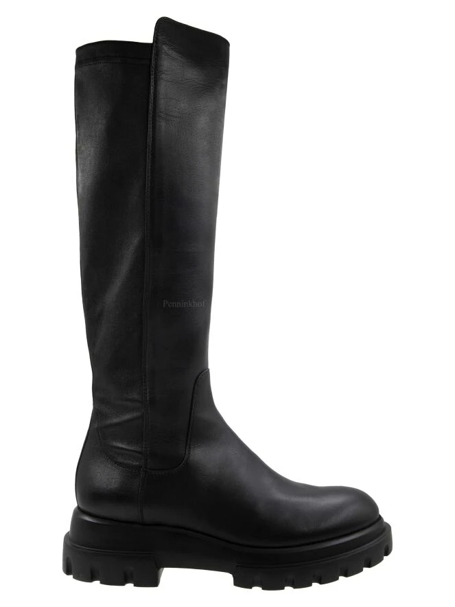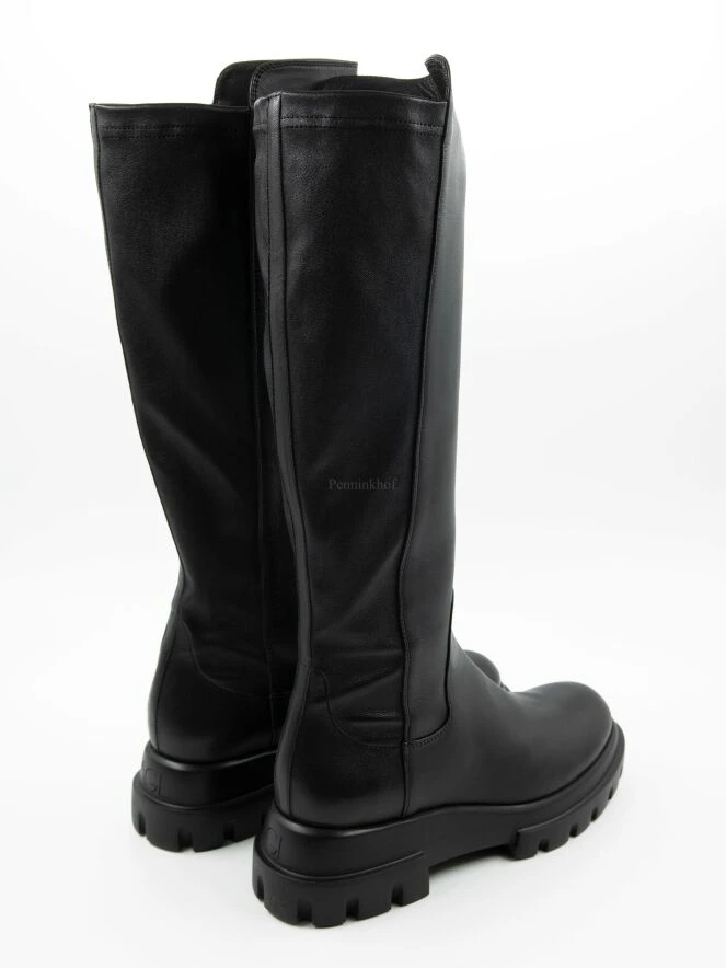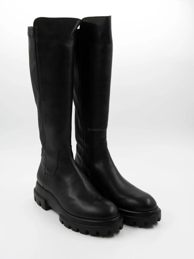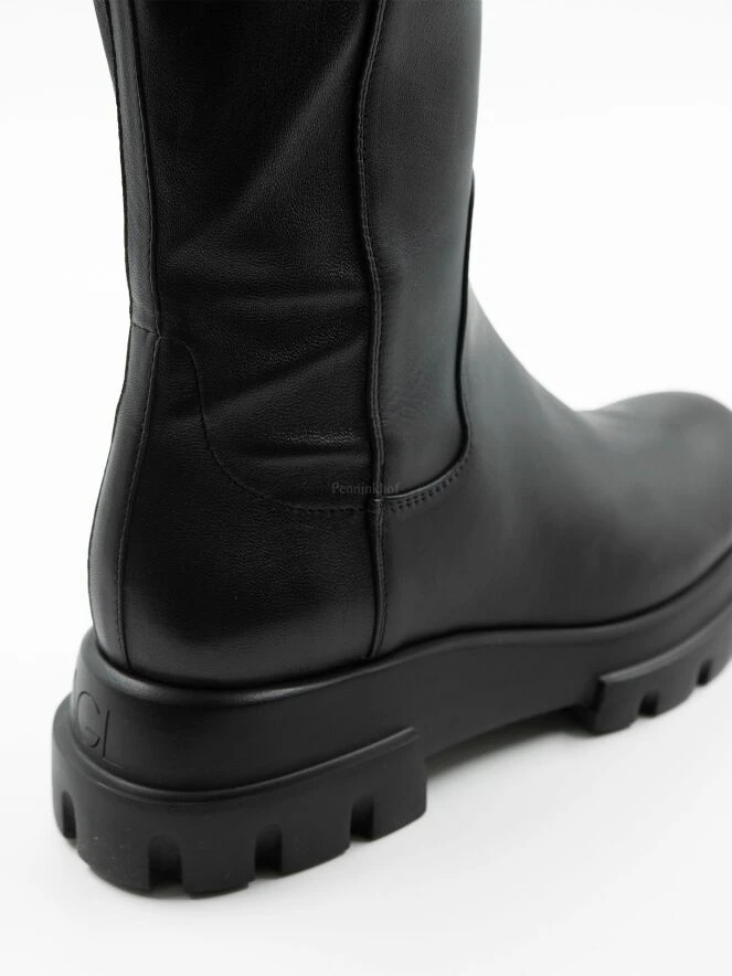 Ein Stiefel von AGL in der Farbe schwarz. Der Stiefel hat eine grobe Sohle. Die Rückseite des Schaftes ist aus einem schwarzen elastischen Stoff. Die schwarze Sohle ist mit Einkerbungen. Die Innenseite des Schaftes ist teilweise mit Leder gefüttert.