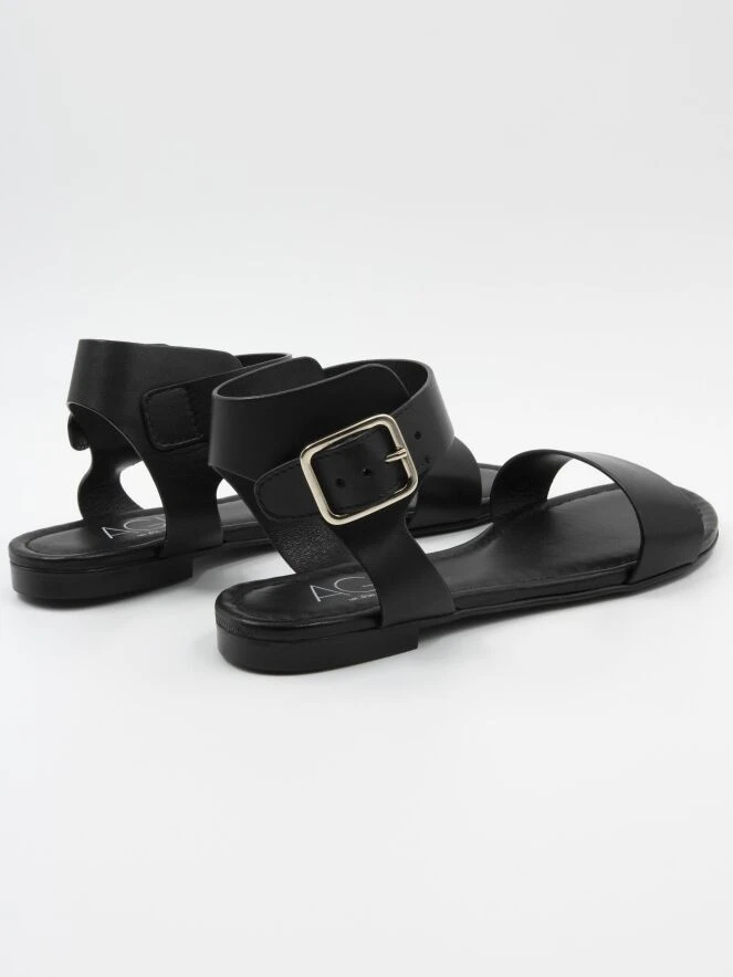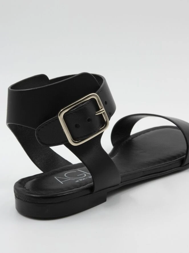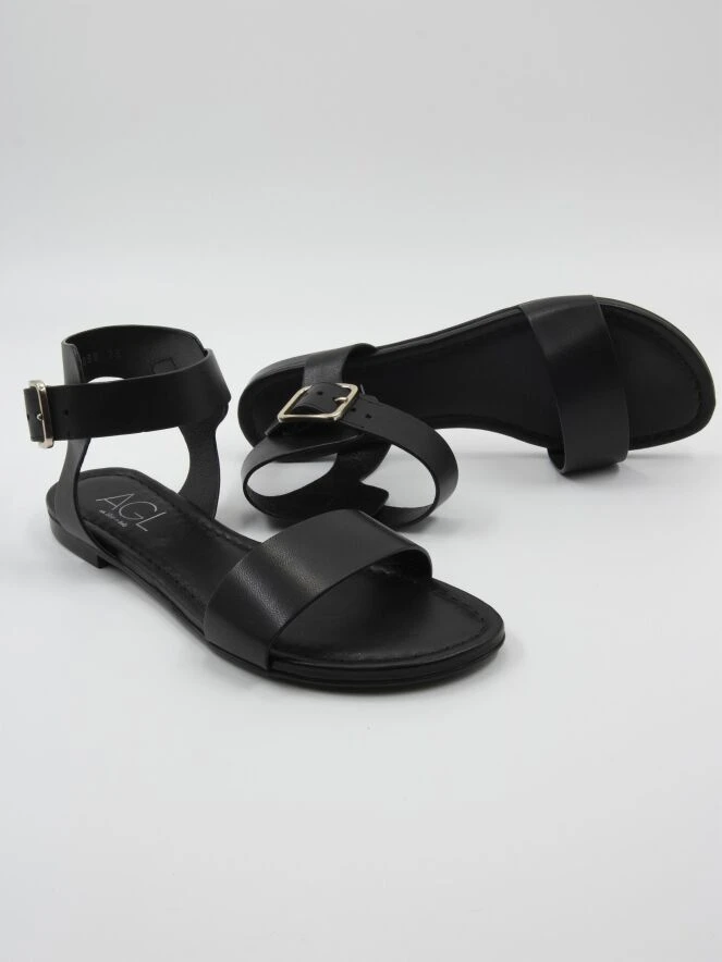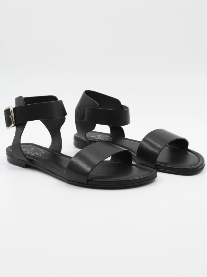 Eine Sandale von AGL in Schwarz. Über den Vorderfuß verläuft ein schmaler Riemen. Die Sandale hat eine offene Ferse und das Fersenband ist verstellbar. Das Leder ist innen gefüttert.