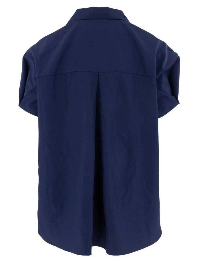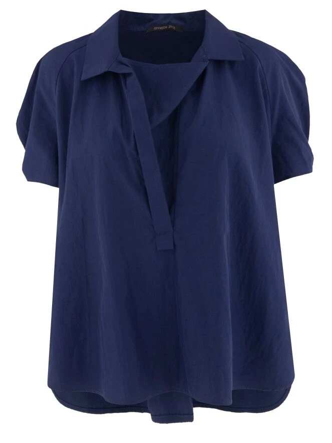 Ein weites Shirt von Annette Görtz in Indigoblau. Das Shirt hat einen geschlossenen V-Ausschnitt, der optisch wie ein fallender Ausschnitt wirkt. Es hat kurze Ärmel und kann bei 30 Grad gewaschen werden.