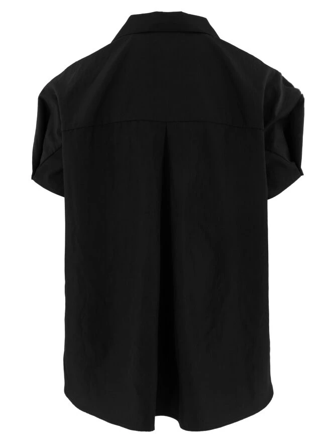 Ein weit geschnittenes Shirt von Annette Görtz in Schwarz. Das Shirt hat einen geschlossenen V-Ausschnitt, der optisch wie ein fallender Ausschnitt wirkt. Es hat kurze Ärmel und kann bei 30 Grad gewaschen werden.