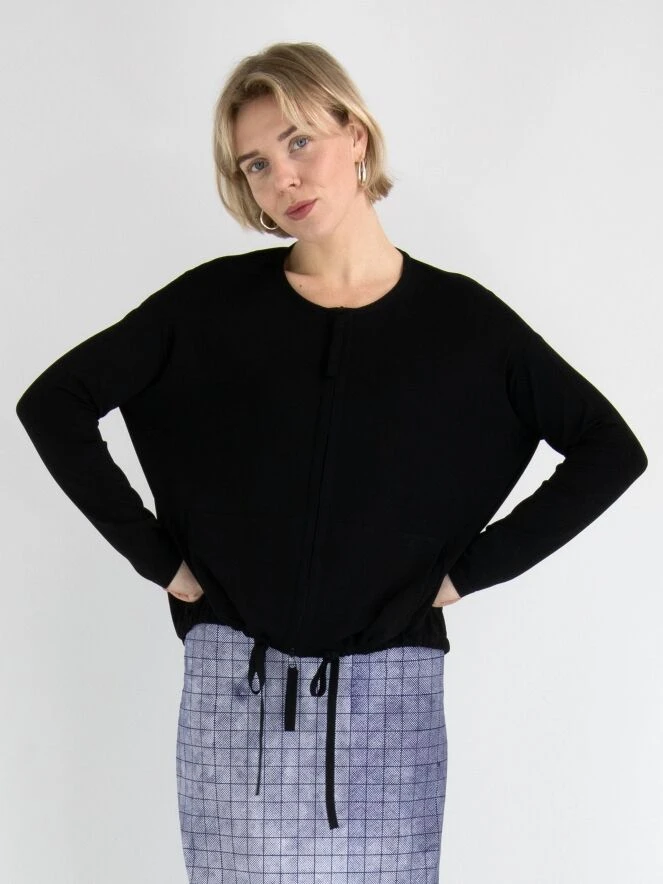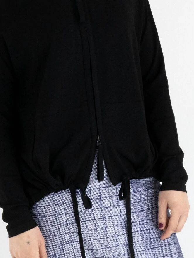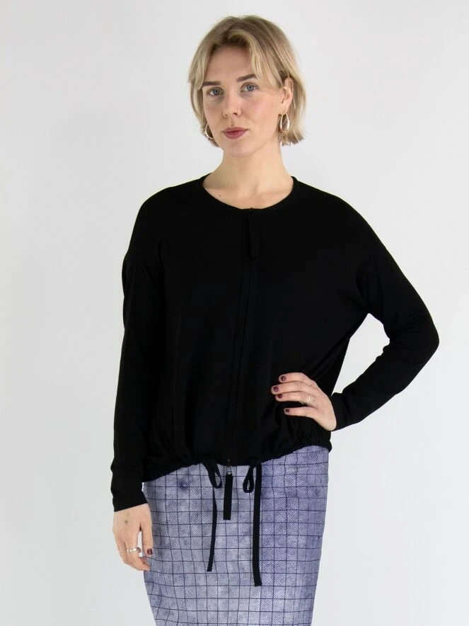 Ein luxuriöses Freizeitweste von Annette Görtz in Schwarz. Die Weste hat einen Reißverschluss und Leistentaschen auf Taillenhöhe. Am unteren Rand befindet sich ein Band in einer Tunnelverarbeitung, mit dem ein Falteneffekt erzeugt werden kann. Diese Weste kann bei 30 Grad gewaschen werden.