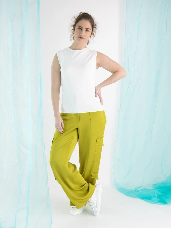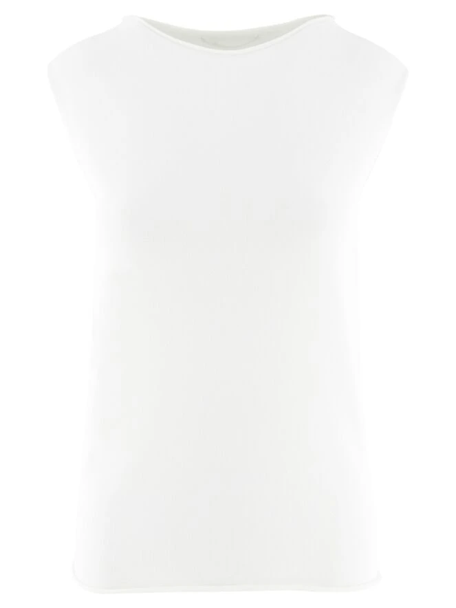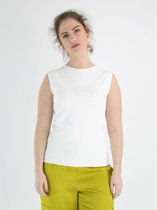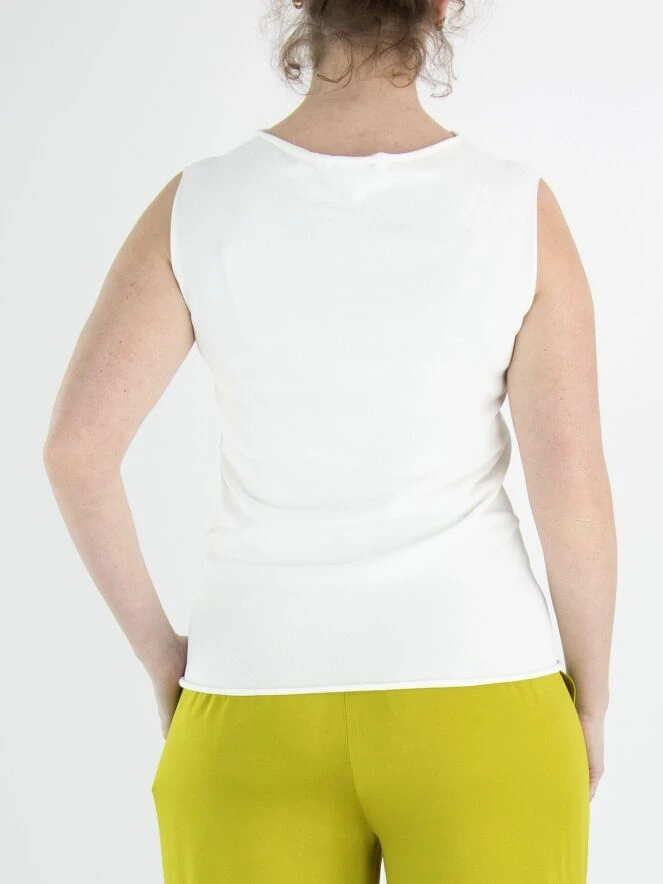 Ein luxuriöses Top von Annette Görtz in Cremeweiß. Der Rand des runden Halsausschnitts und der untere Saum sind gerafft. Dieses Top kann bei 30 Grad gewaschen werden.