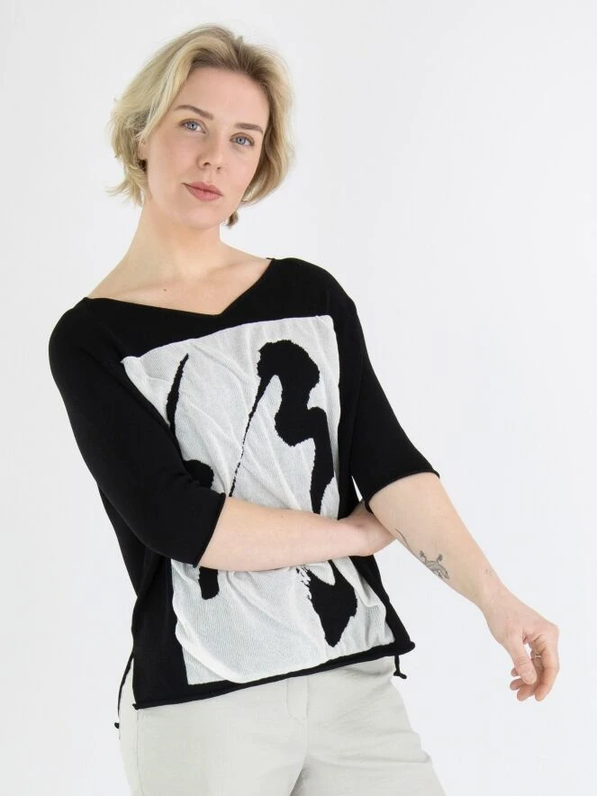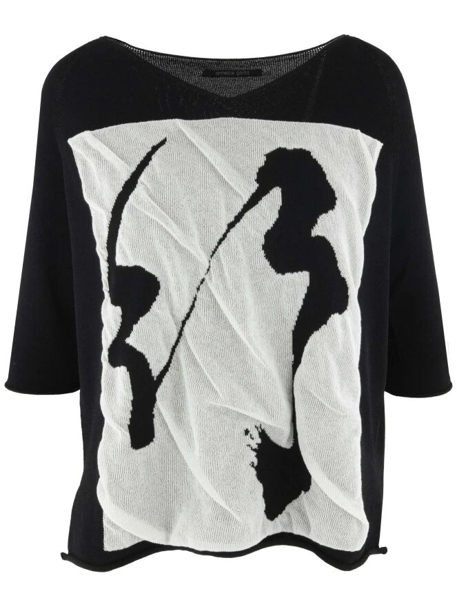 Ein luxuriöser Pullover von Annette Görtz in schwarzer Farbe mit einem grafischen Druck in cremeweiß auf der Vorderseite als 2. Stoff, der am Pullover befestigt ist. Der Saum des Unterteils ist gerüscht. Der Pullover hat einen V-Ausschnitt und kann bei 30 Grad gewaschen werden.