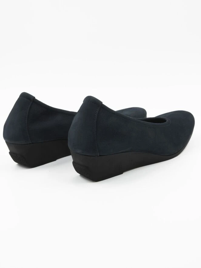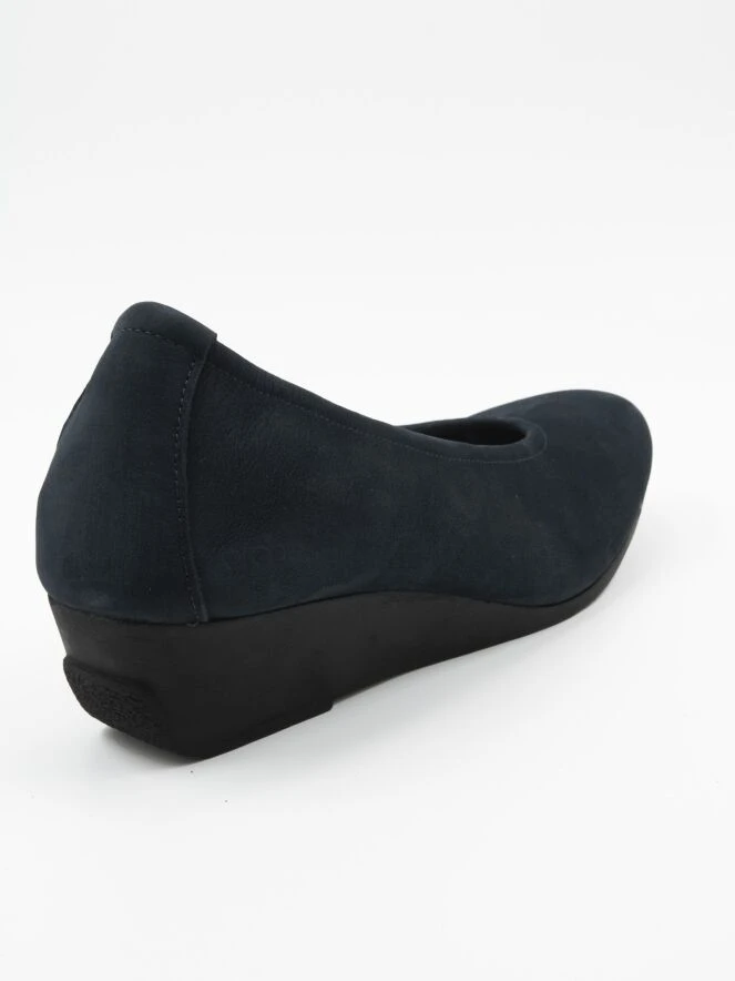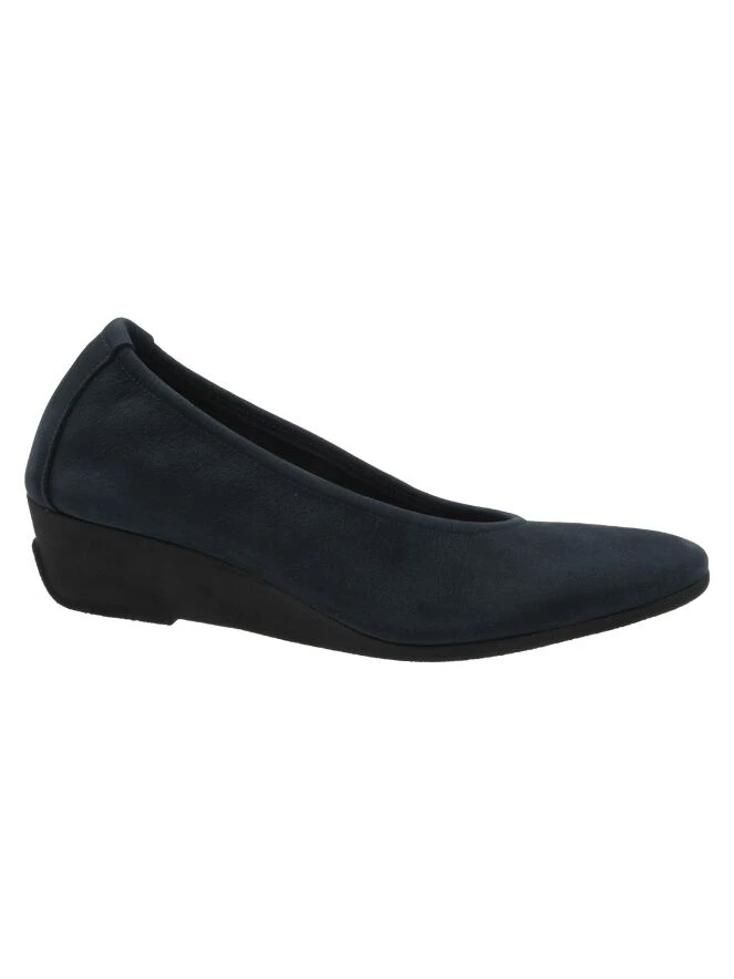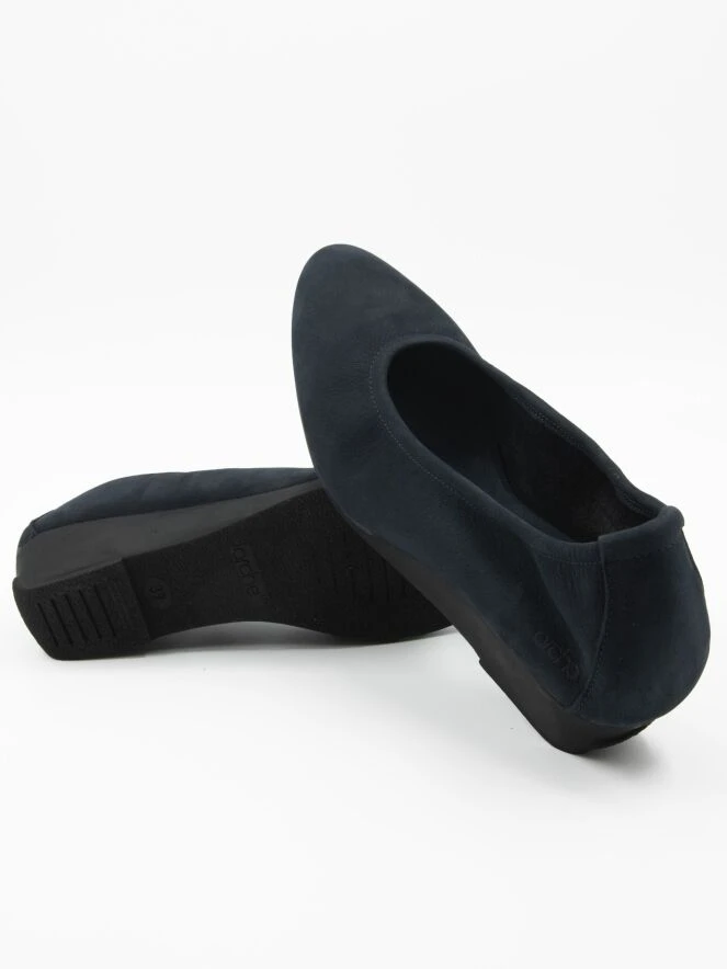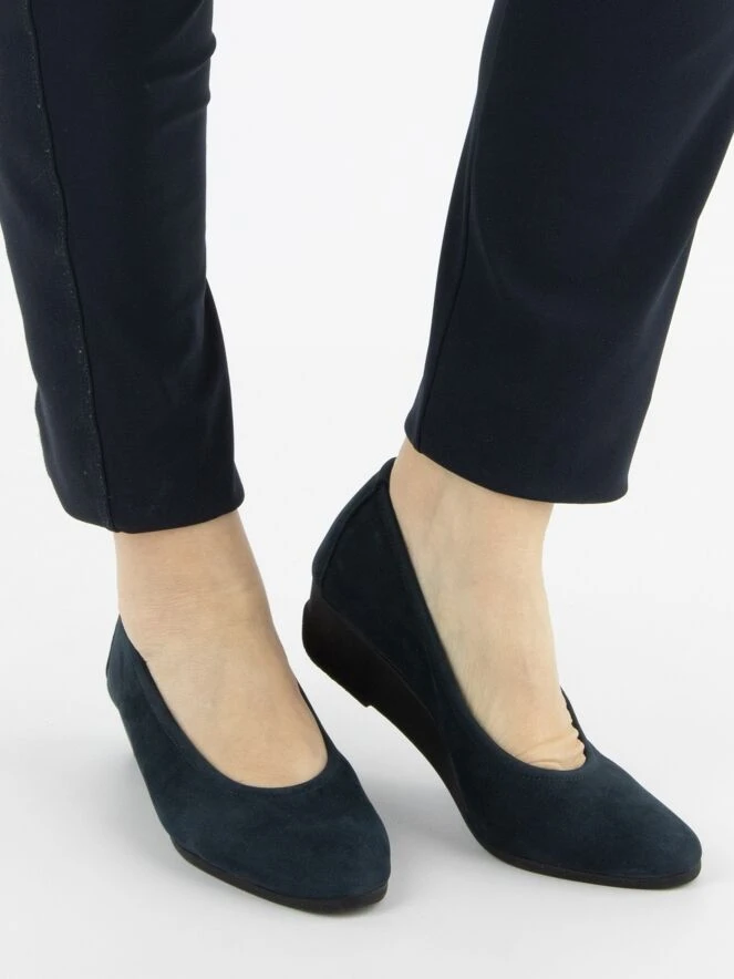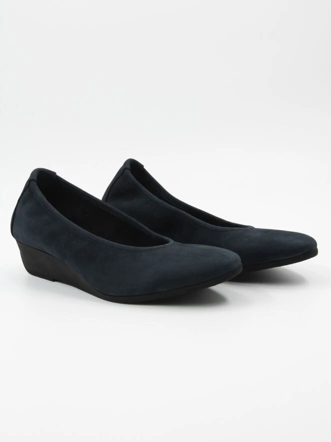 Halbschuhe von Arche in der Farbe Marineblau. Der Halbschuh hat einen Keilabsatz aus Latex und eine schmale Spitze. Die Innenseite ist ungefüttert.