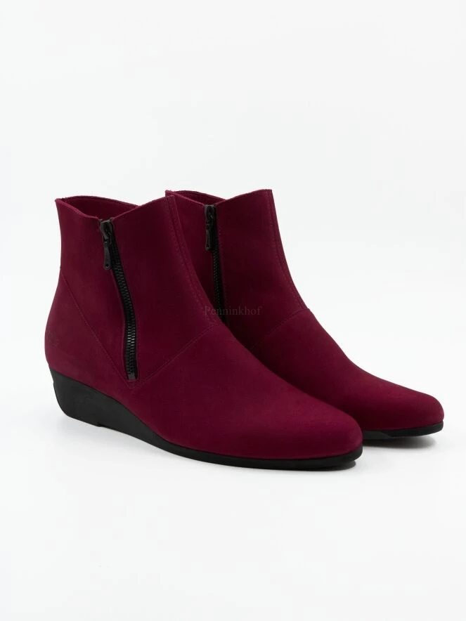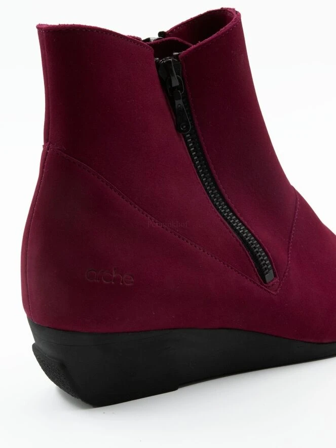 Eine Stiefelette von Arche in der Farbe fuchsia. Der Stiefel hat eine schlanke Zehenkappe. Auf beiden Seiten des Schafts befindet sich ein Reißverschluss. Die Innenseite ist ungefüttert.