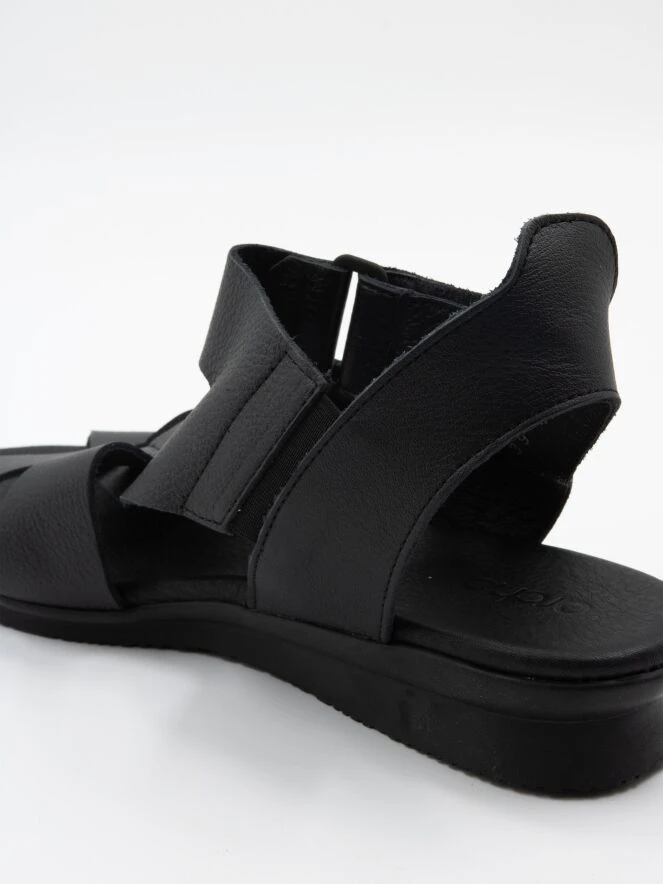 Ein Sandale von Arche in der Farbe Schwarz. Das Leder ist über dem Vorfuß gekreuzt, und der Riemen zur Ferse ist mit Klettverschluss verstellbar. Das Fußbett besteht aus dem gleichen Leder wie die Sandale.