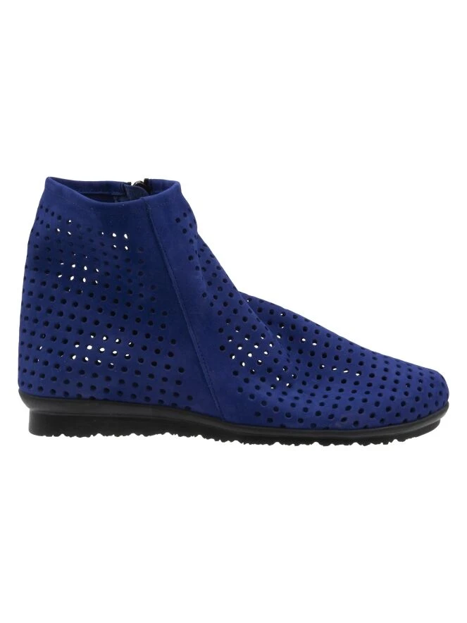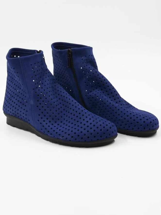 Eine kurze Stiefelette von Arche in kobaltblau. Das Nubuk-Wildleder ist fein perforiert. An der Innenseite befindet sich ein Reißverschluss und der Stiefel hat eine runde Spitze.