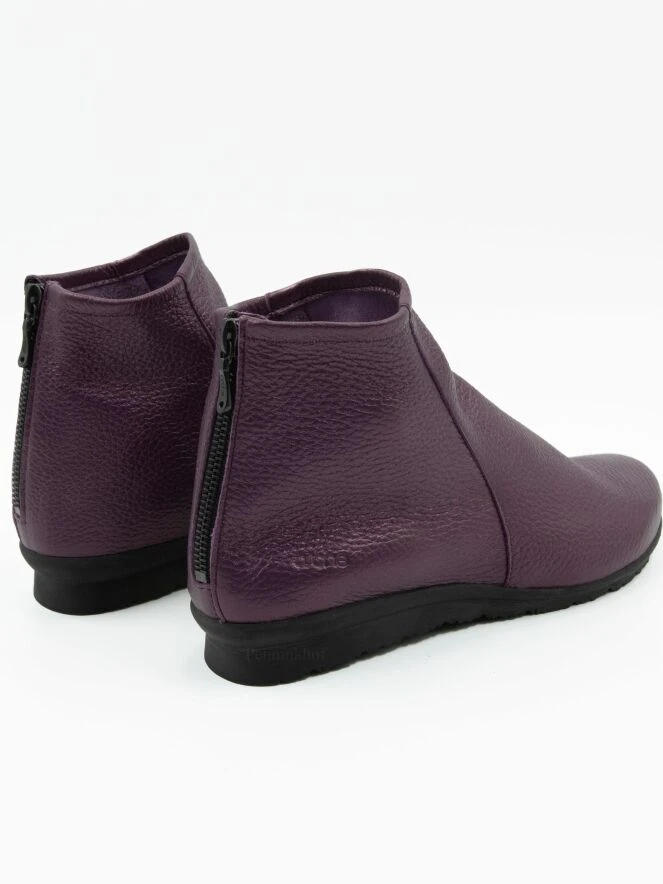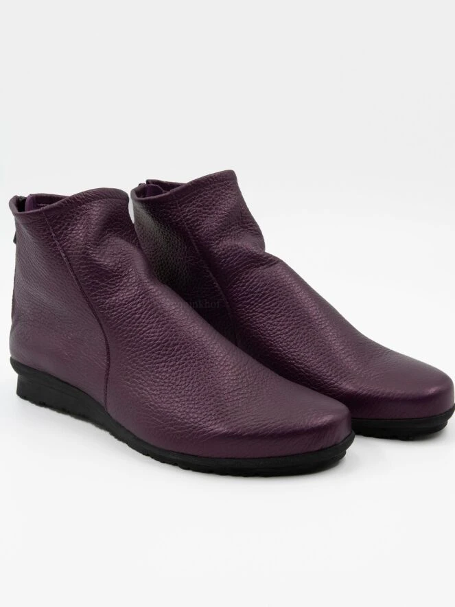 Eine kurze Stiefelette von Arche in metallischem Lila. An der Ferse befindet sich ein Reißverschluss. Die Innenseite ist ungefüttert und der Stiefel hat eine runde Schuhspitze.