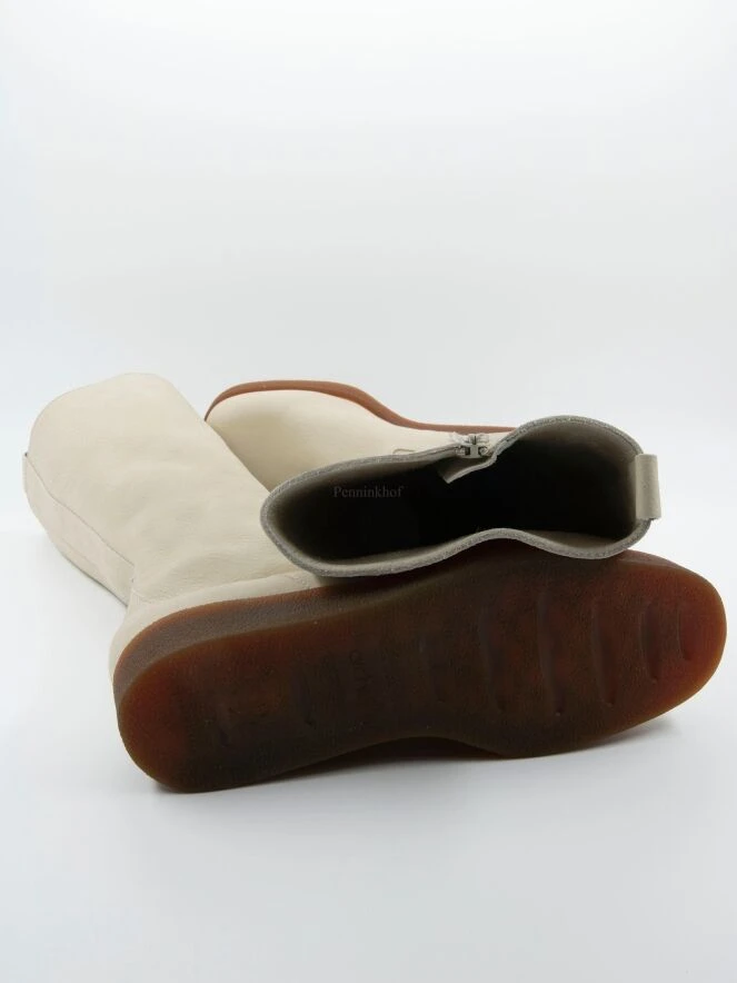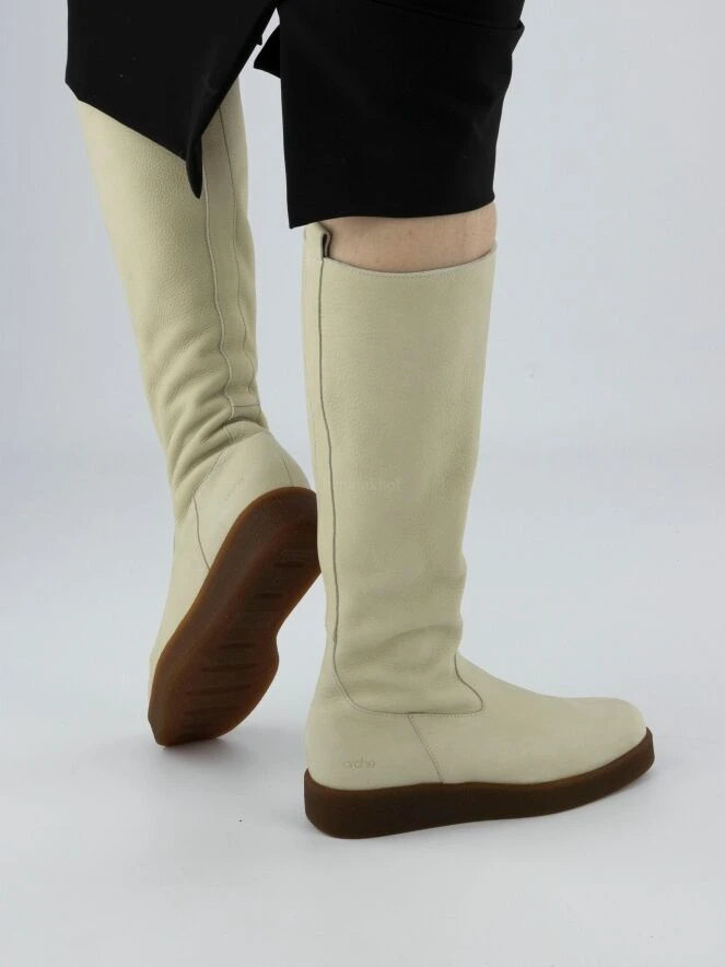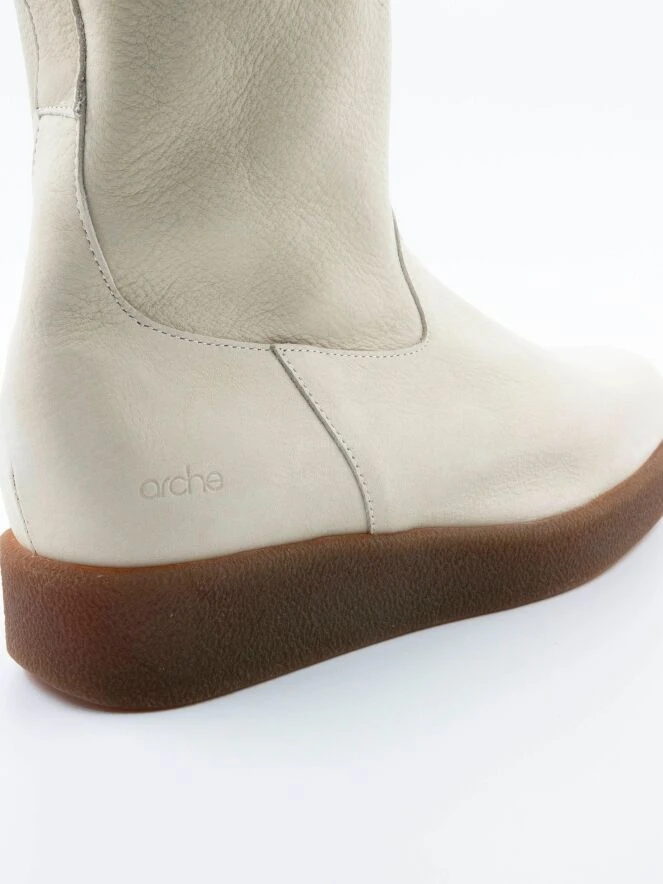 Ein hoher Stiefel von Arche in cremeweiß. An der Innenseite des Schafts befindet sich ein Reißverschluss. Die Sohle ist cognacfarben. Die Innenseite ist ungefüttert.