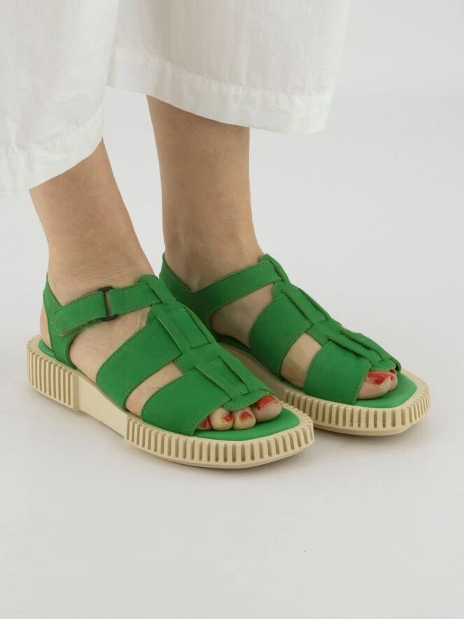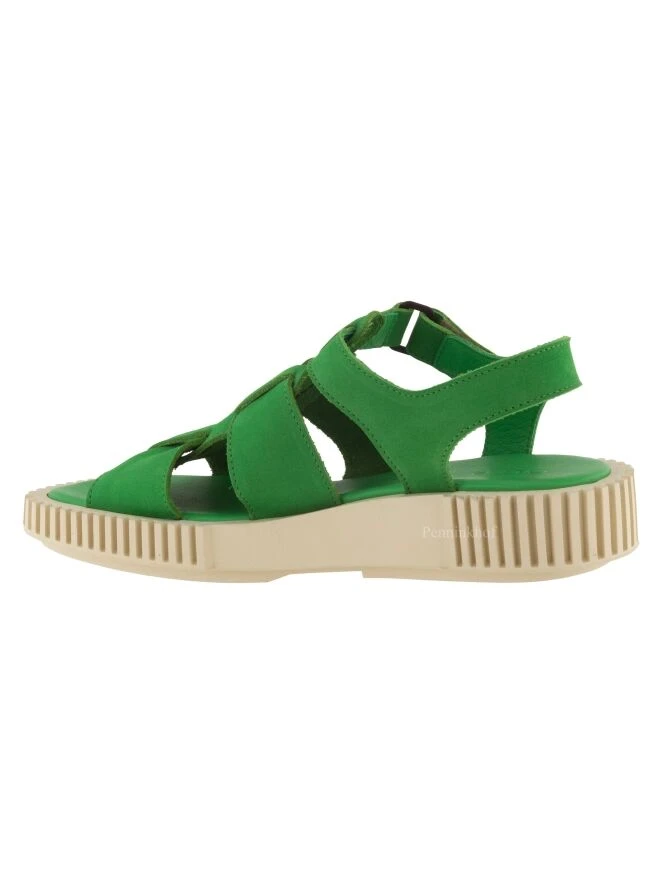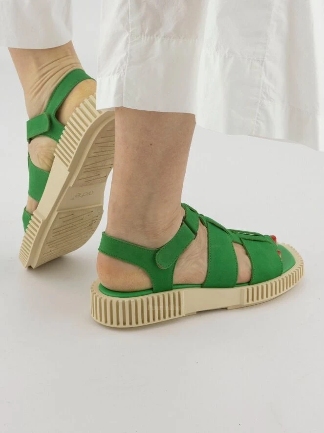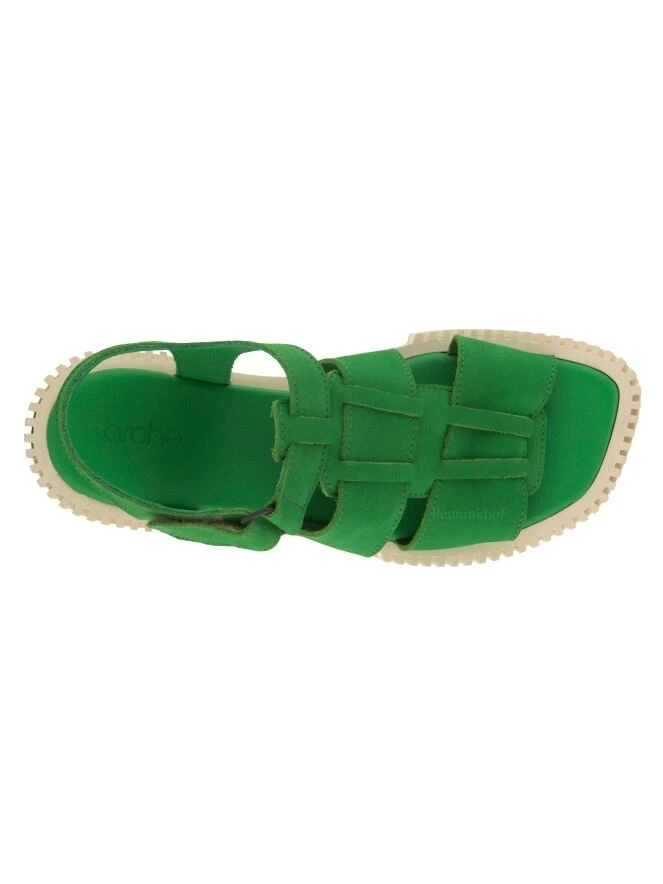 Eine grüne Sandalette der Damenschuhmarke Arche. Die Sohle ist in geraden Linien gerippt. Der Verschluss um den Fuß ist mit einem Klettverschluss verstellbar.