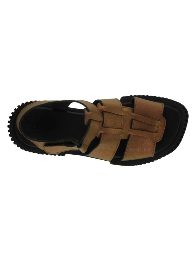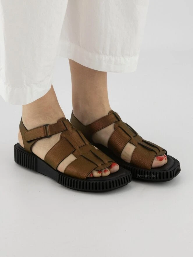 Eine metallic-bronzefarbene Sandalette der Schuhmarke Arche. Die Sohle ist in geraden Linien gerippt. Der Verschluss um den Fuß ist mit einem Klettverschluss verstellbar.