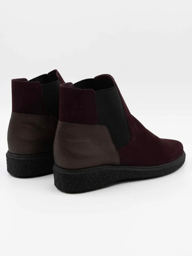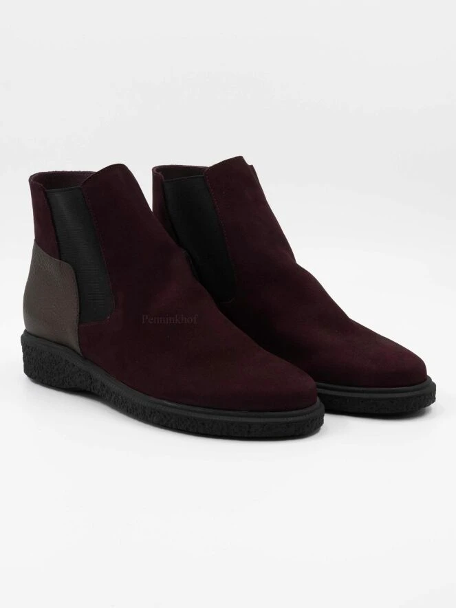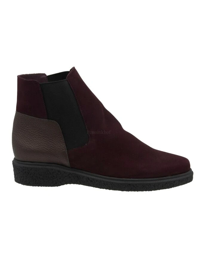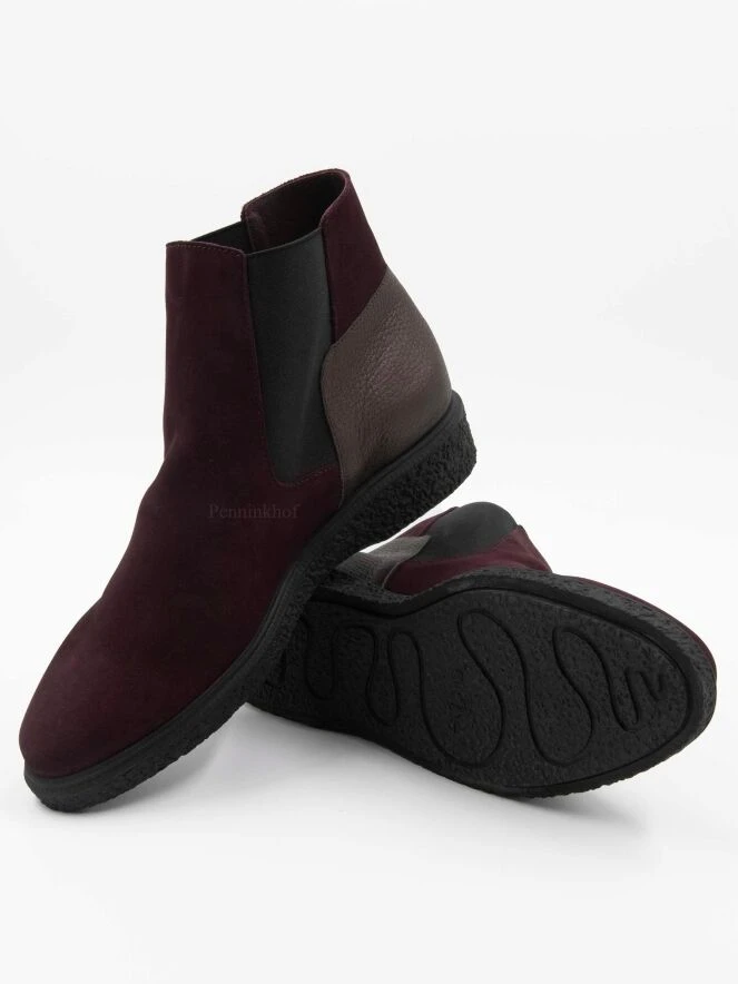 Eine Stiefelette von Arche in der Farbe burgunderrot. An beiden Seiten des kurzen Schafts ist ein elastisches Stück Stoff eingesetzt. An der Ferse befindet sich ein weinrotes Lederstück. Der Stiefel ist ungefüttert.