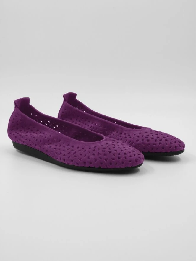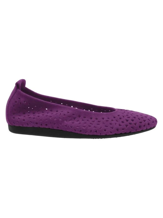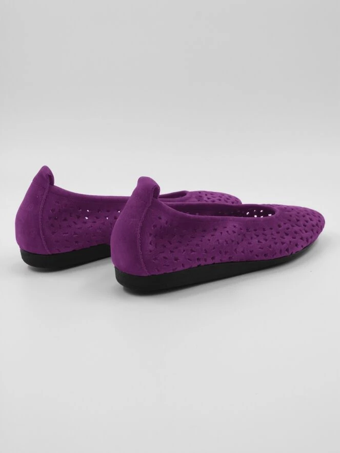 Eine Ballerina von Arche in der Farbe Fuchsia. Das Nubuk-Wildleder ist perforiert mit verschiedenen Formen, darunter Sterne und Dreiecke. Die Ballerina hat eine runde Spitze und ist ungefüttert.
