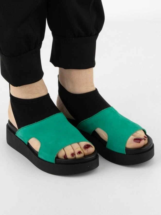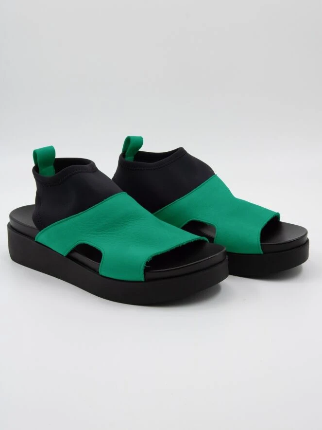 Eine Sandale von Arche mit einer Plateausohle in Türkis. Vom oberen Teil des Vorderfußes bis zum Knöchel befindet sich ein schwarzer elastischer Stoff.