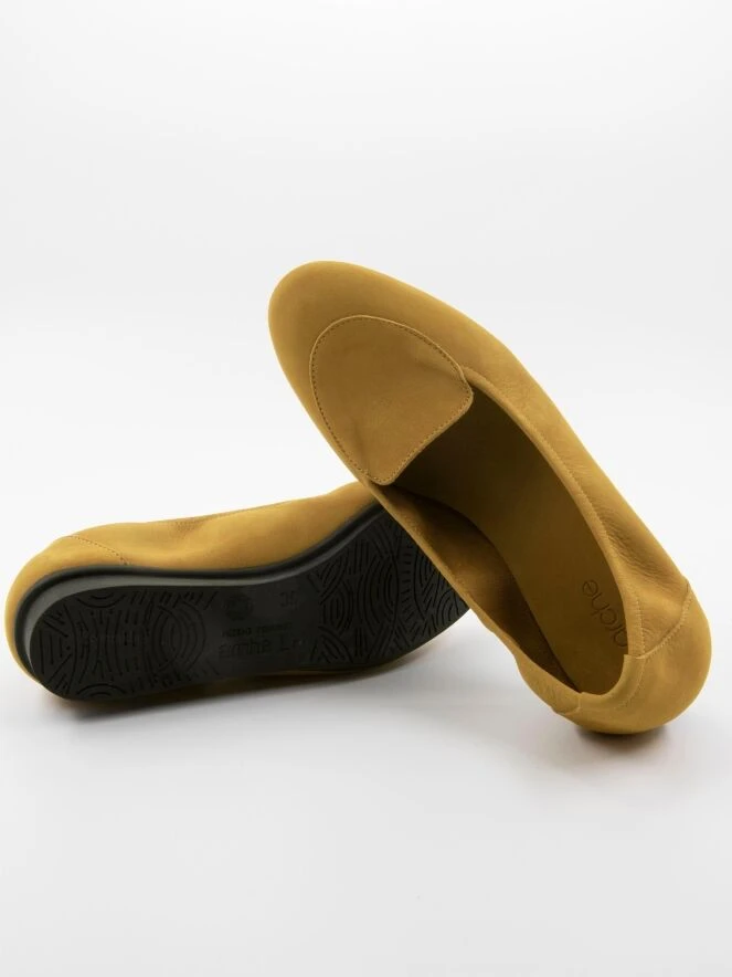 Ein Halbschuh in Ockergelb mit einer erhöhten Sohle an der Ferse. Die Innenseite ist ungefüttert.