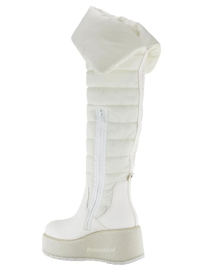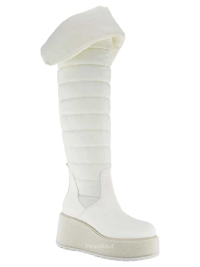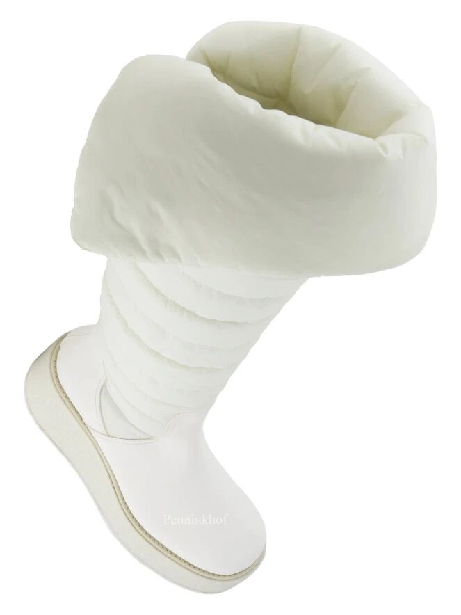 Ein Design-Boot der Schuhmarke Barracuda in Cremeweiß. Der Schaft besteht aus einem abgesteppten wattierten Gewebe und hat einen breiten Umschlag. Der Fußbereich ist aus Qualitätsleder.