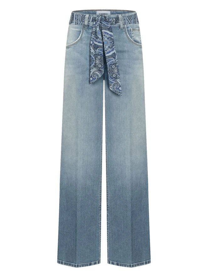 Eine weite Jeans von Cambio in einer Basisjeansfarbe. Die Jeans ist im 5-Pocket-Modell und hat in der Taille einen Schal-Gürtel in Barockdruck mit mehreren Jeansblau-Tönen. Diese Jeans kann bei 30 Grad gewaschen werden.