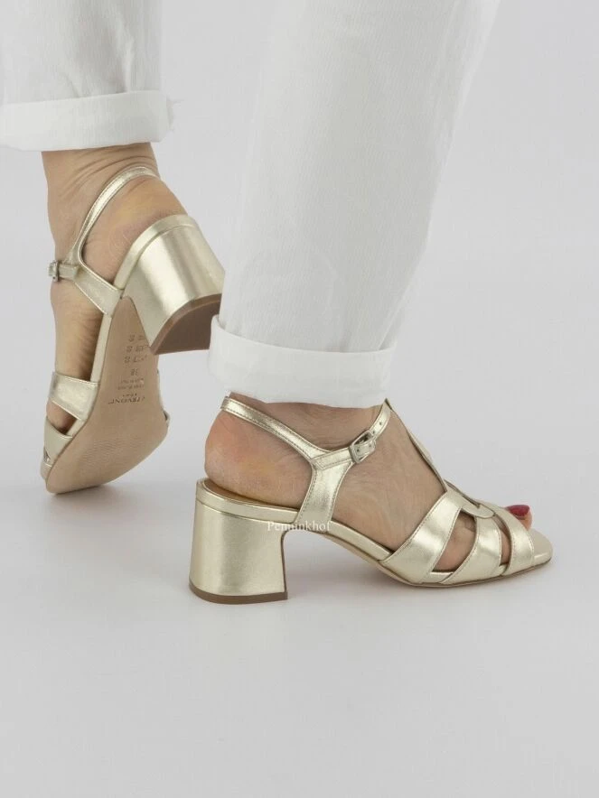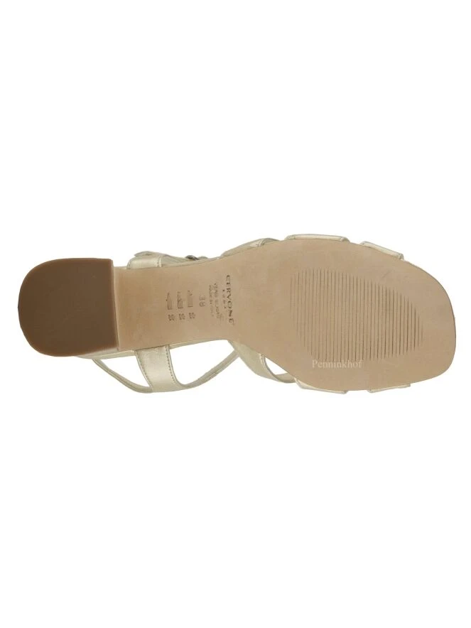 Ein offener Pumps der Schuhmarke Cervone in Platin. Der vordere Fußteil ist mit dem verstellbaren Knöchelriemen verbunden. Der Blockabsatz ist mit dem gleichen Material wie der gesamte Pumps bezogen.