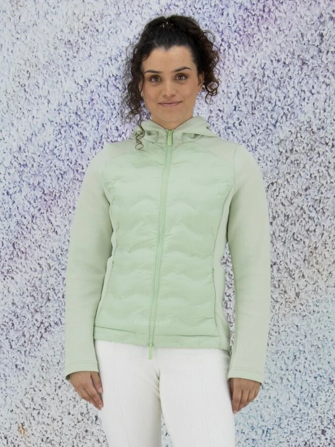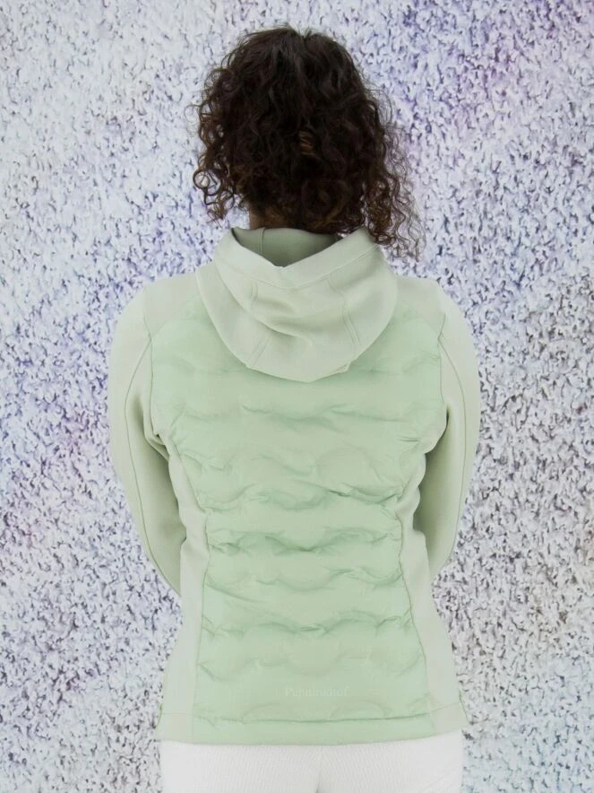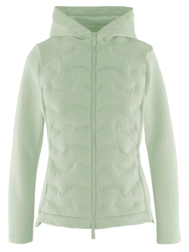 Ein Steppmantel mit Wellenmuster der Designermarke Fuchs Schmitt in Mintgrün. Der Mantel hat eine Kapuze. Der untere Saum hat beidseitig einen Reißverschluss, mit denen ein Schlitz erzeugt werden kann. Dieser Mantel kann bei 30 Grad gewaschen werden.