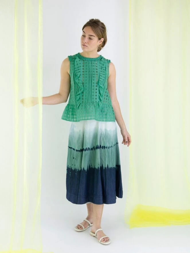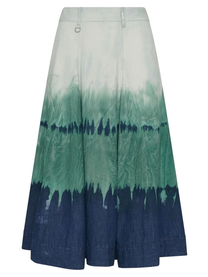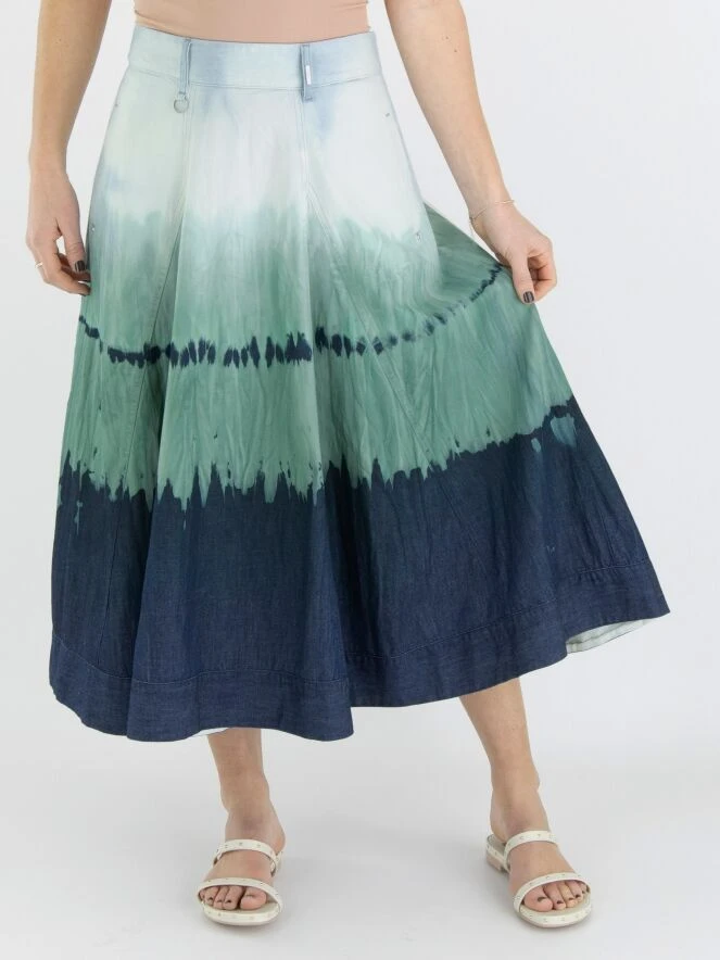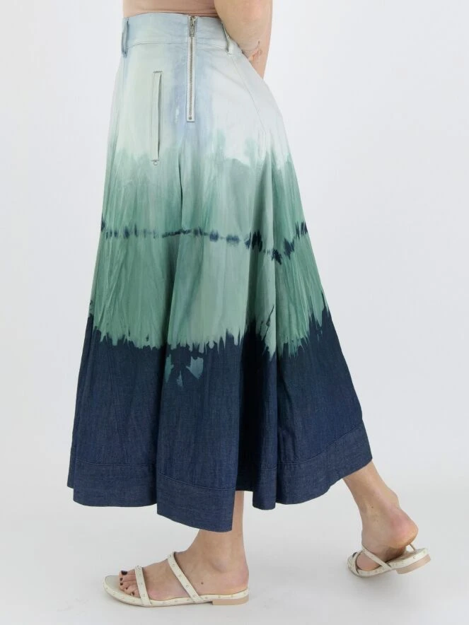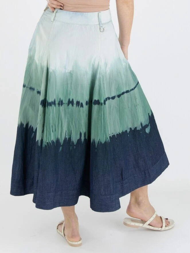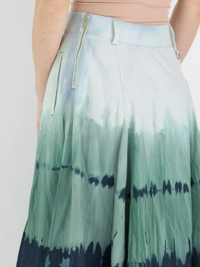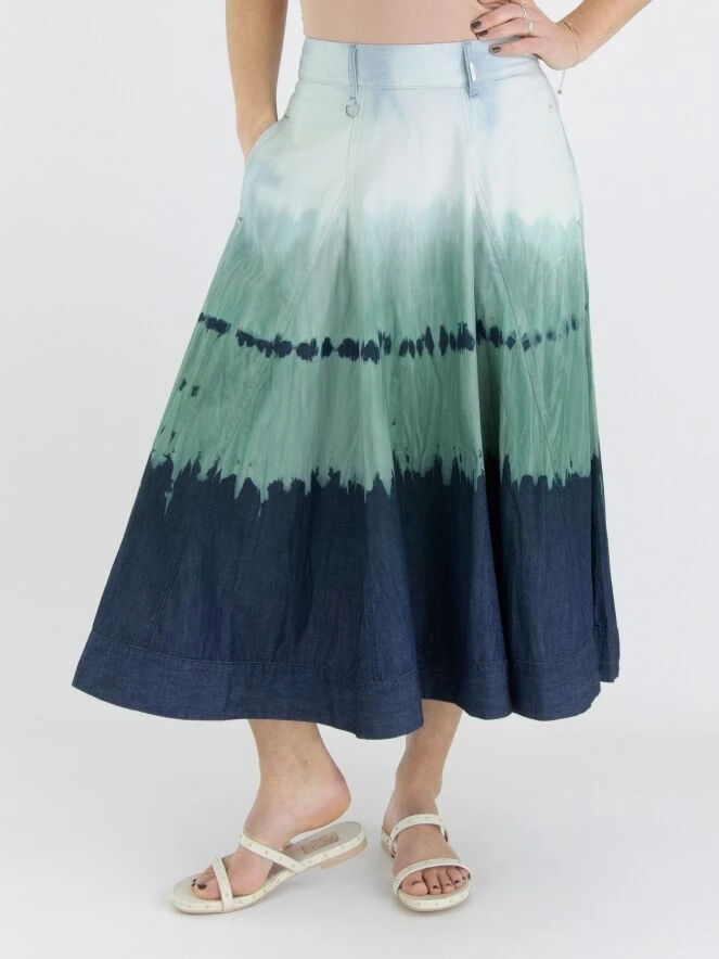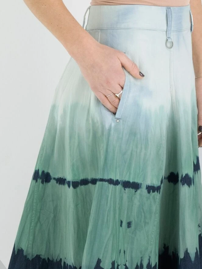 Ein weiter Rock von High in einem dégradé Batik-Druck mit den Farben Eisblau, Mintgrün und Jeansblau. Der Rock hat Seitentaschen und kann bei 30 Grad gewaschen werden.
