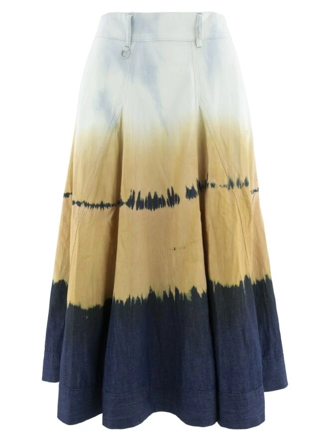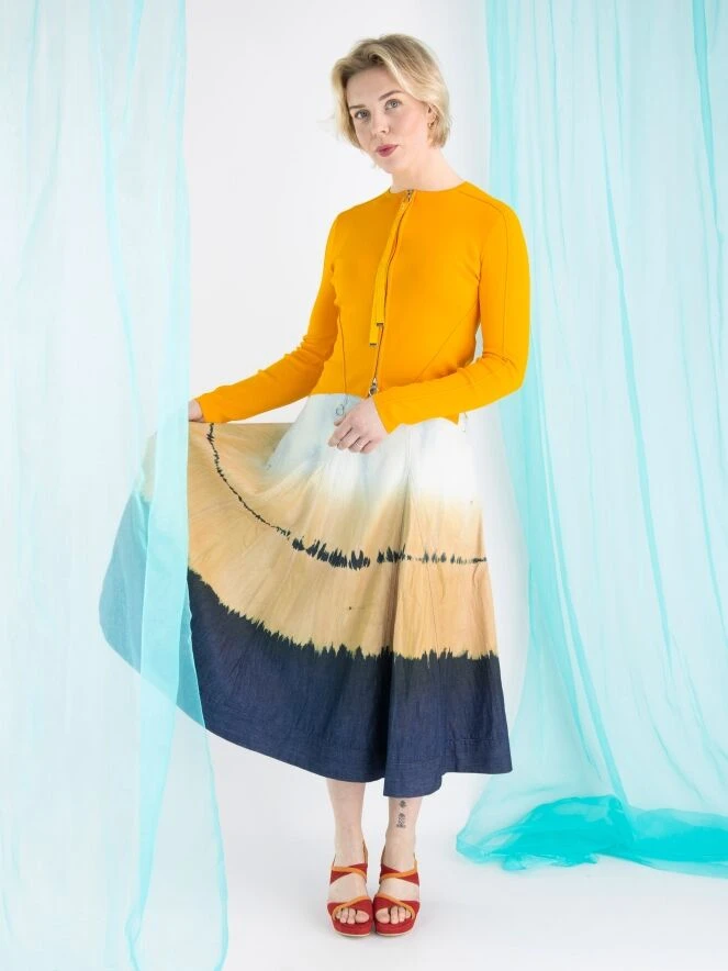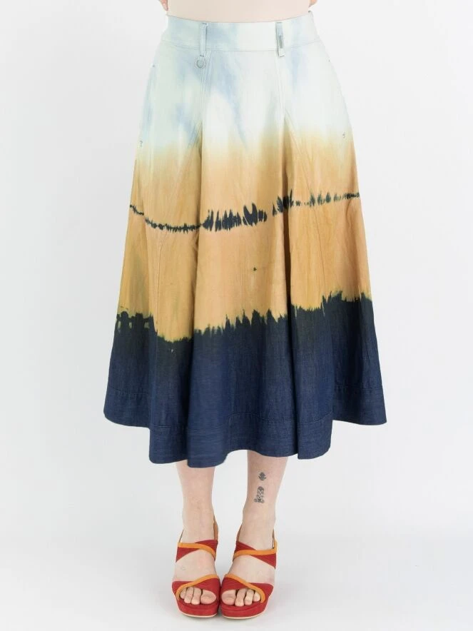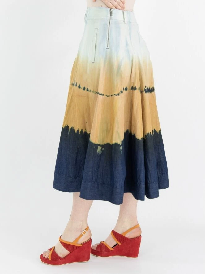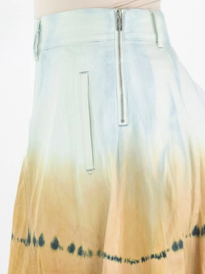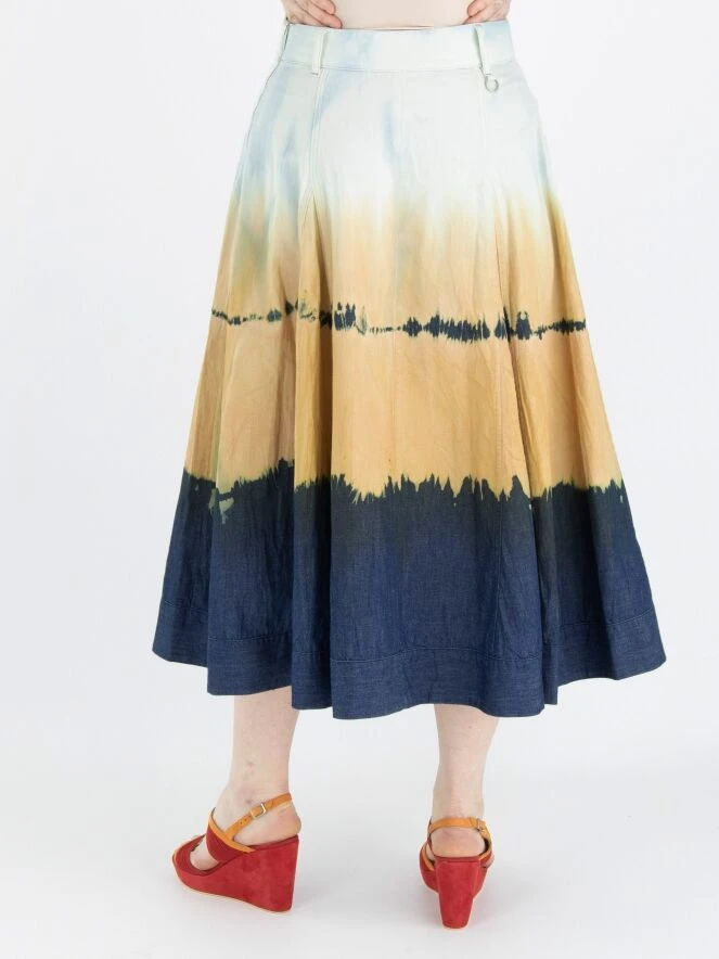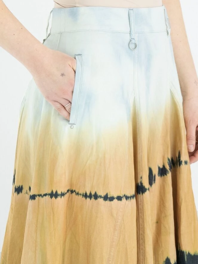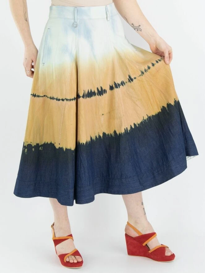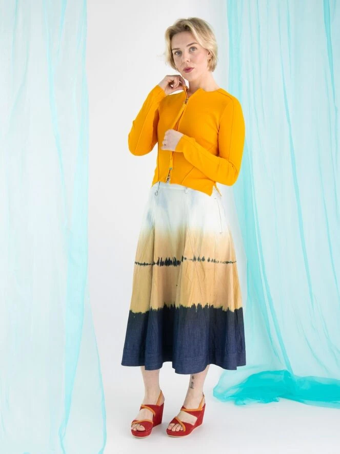 Ein weiter Rock von High in einem dégradé Batik-Druck mit den Farben Eisblau, Orange und Jeansblau. Der Rock hat Seitentaschen und kann bei 30 Grad gewaschen werden.