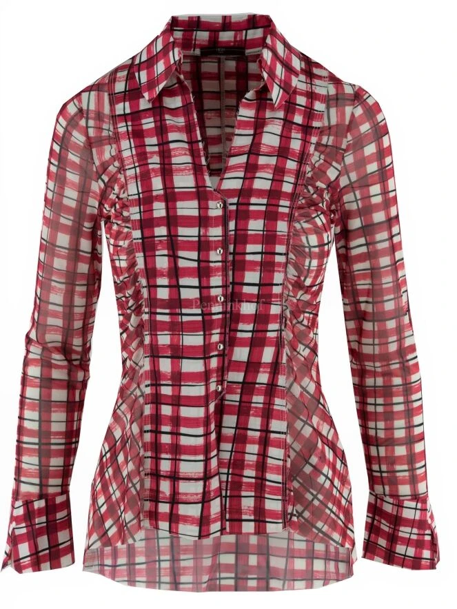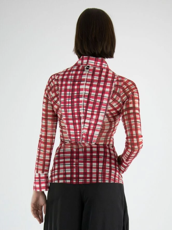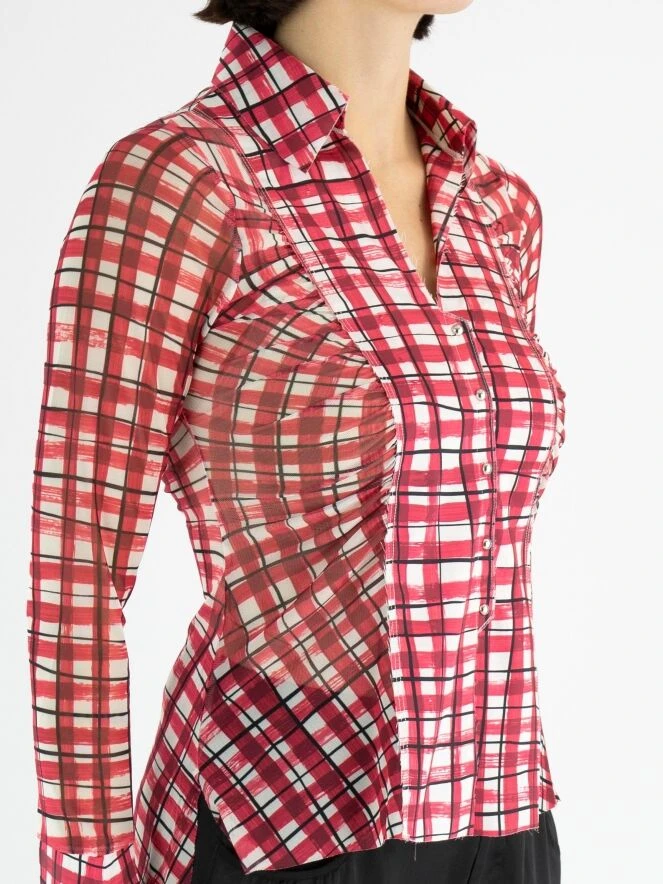 Eine Bluse von High in einem Blockdruck mit den Farben Weiß, Rot und Schwarz. Die Seiten und Ärmel der Bluse sind aus einem transparenten Stoff. Der Verschluss besteht aus dekorativen Druckknöpfen mit silberfarbenen runden Nieten. Diese Bluse kann von Hand gewaschen werden.