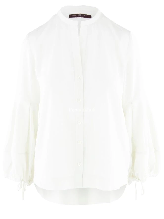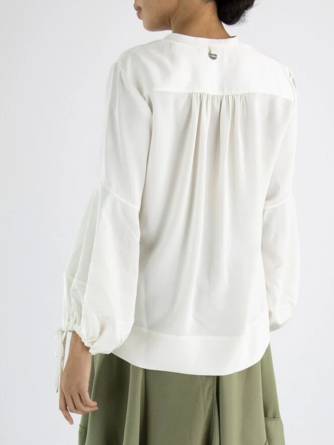 Eine Bluse von High in Cremeweiß. Die Vorderseite und die untere Hälfte der langen Ärmel sind aus einem matt glänzenden Satinstoff, während die Rückseite und die obere Hälfte der Ärmel aus einem matten Stoff gefertigt sind. Die Bluse hat einen runden Halsausschnitt mit einem V-Ausschnitt in der Mitte der Vorderseite. Ab dem Ellbogen hat die Bluse Ballonärmel mit einem Kordelzug in Tunnelverarbeitung an den Enden, was einen fein gefalteten Effekt erzeugt. Diese Bluse kann von Hand gewaschen werden.
