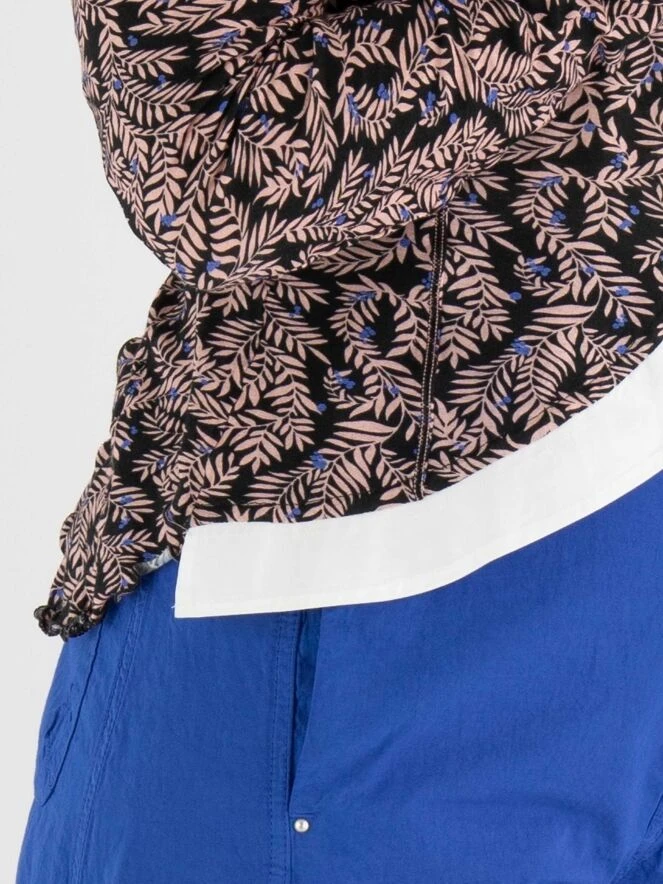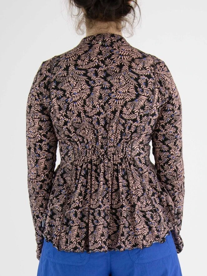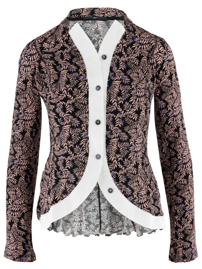 Ein Weste von High mit einem Farnblattdruck in Rosa und Lavendelblau auf schwarzem Hintergrund. Entlang des Knopfverschlusses befindet sich eine weiße Borte, die unten abgerundet ist. Auf der Rückseite befindet sich auf Taillenhöhe ein fein plissierter Gummibund. Diese Weste kann von Hand gewaschen werden.