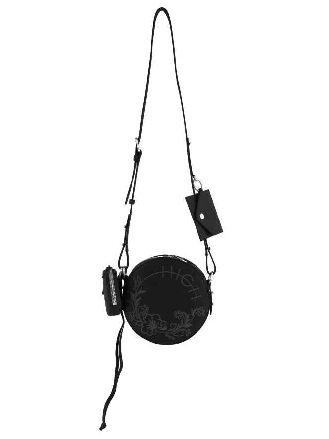 Eine Designer-Schultertasche von High in Schwarz, unterteilt in drei Taschen. Die „große“ runde Tasche hat außen ein besticktes Blumendesign mit dem Text ‚High‘. Beide runden Taschen haben einen Reißverschluss. Die kleine Umschlagtasche hat einen Druckknopfverschluss. Der Schulterriemen ist in zwei Positionen verstellbar.