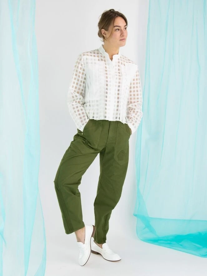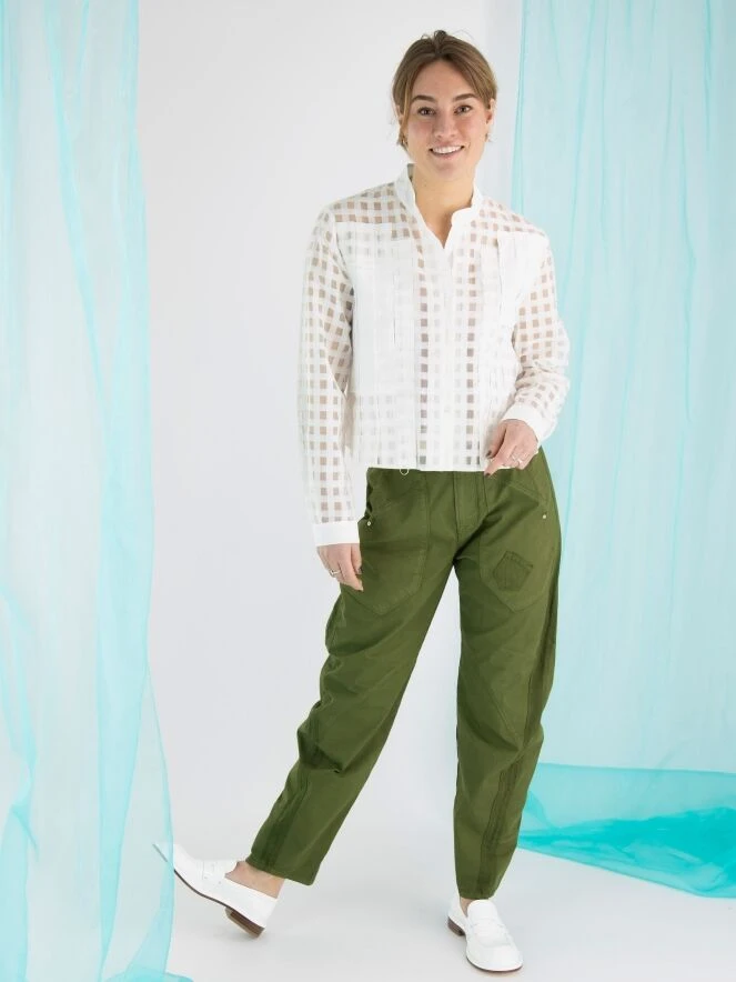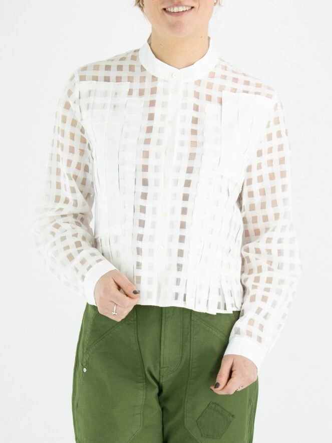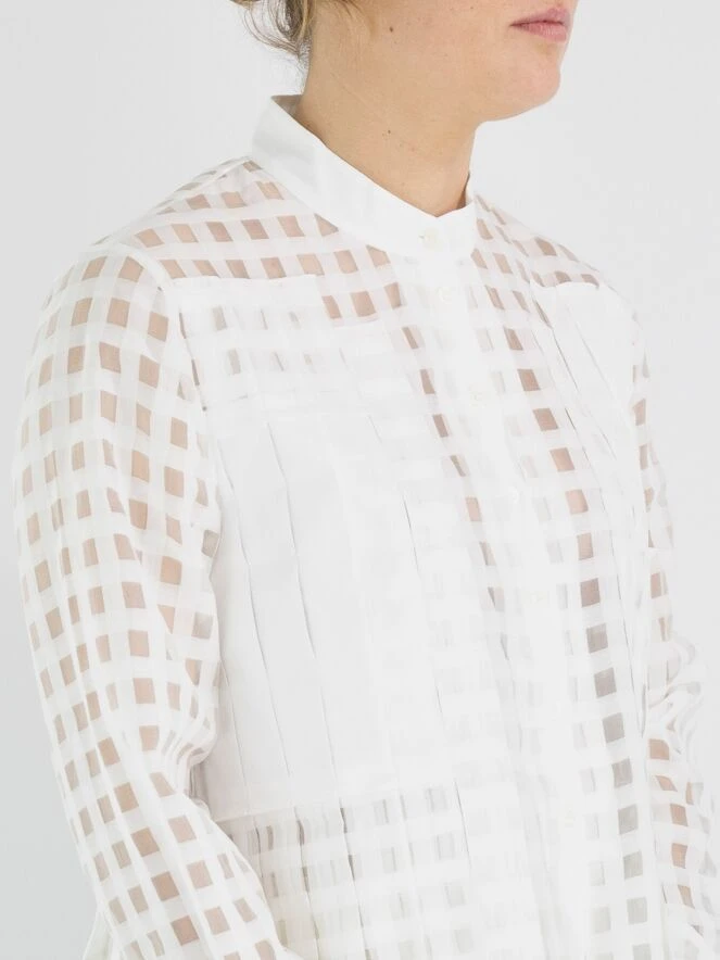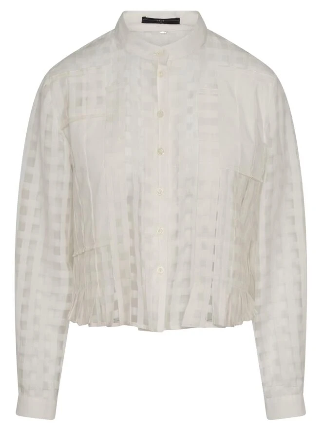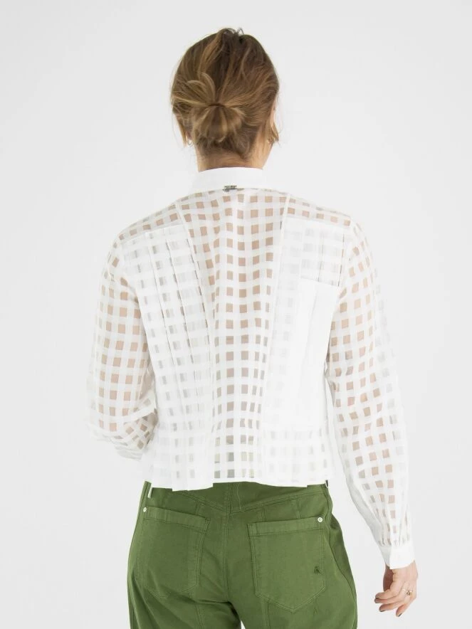 Eine leicht transparente Bluse von High mit mehreren Blockmustern in Weiß. Diese Bluse darf nicht gewaschen werden.