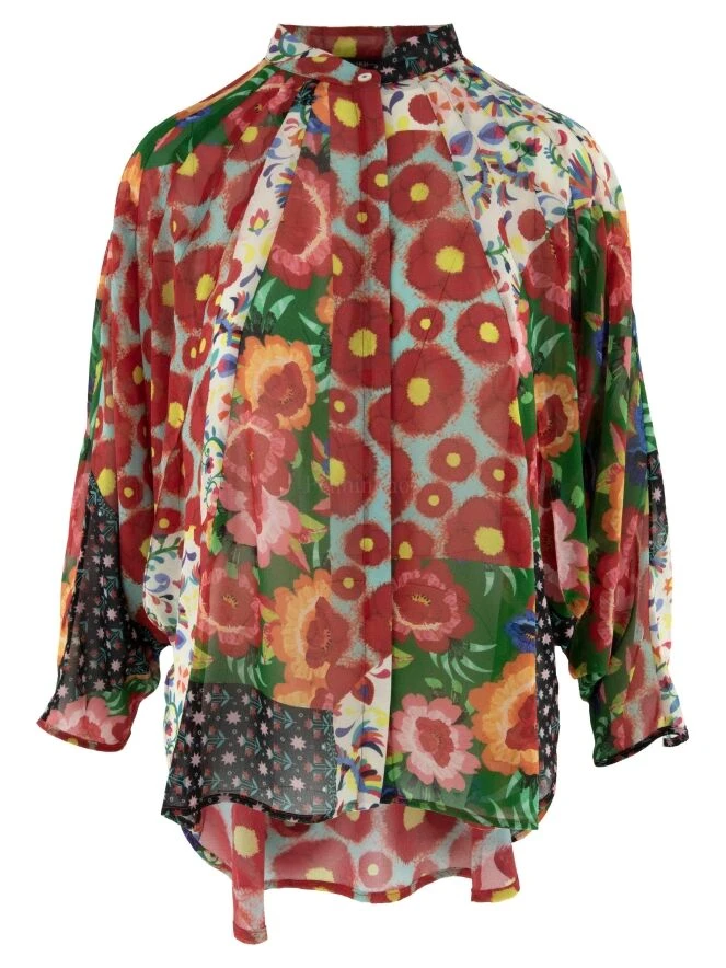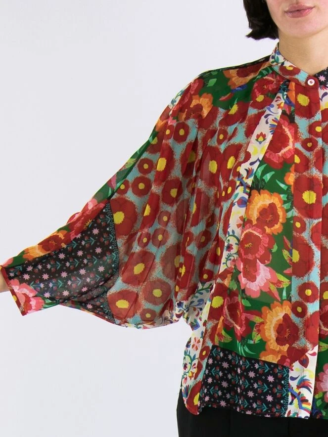 Eine transparente Bluse von High mit einem mehrfarbigen Blumenmuster, wobei Rot die Hauptfarbe ist. Die Bluse hat Fledermausärmel und eine verdeckte Schließung. Diese Bluse kann von Hand gewaschen werden.