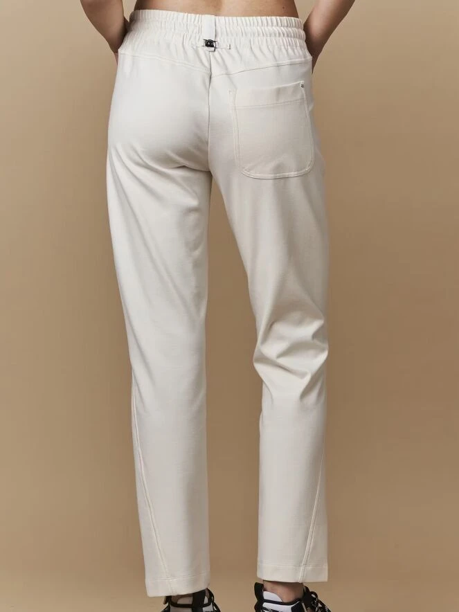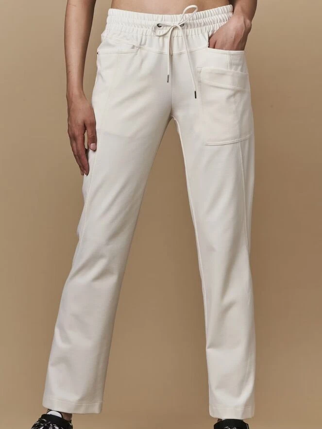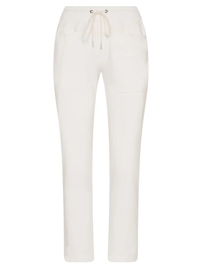 Eine luxuriöse Jogginghose von High in cremeweiß. In der Taille befindet sich ein breites, fein plissiertes elastisches Band mit einem Tunnelzug. Unter der linken Tasche vorne befindet sich eine zweite Tasche. Diese Hose kann bei 30 Grad gewaschen werden.