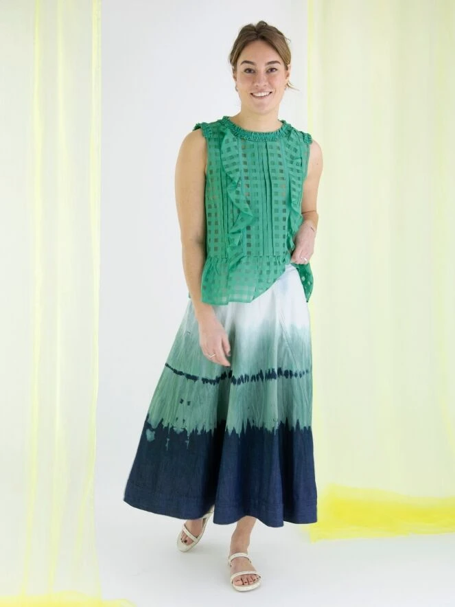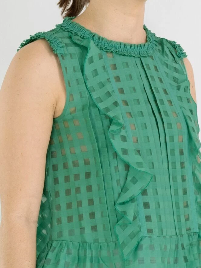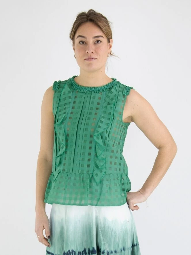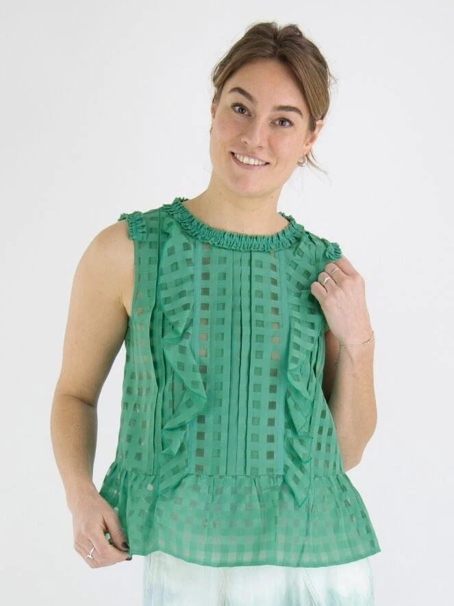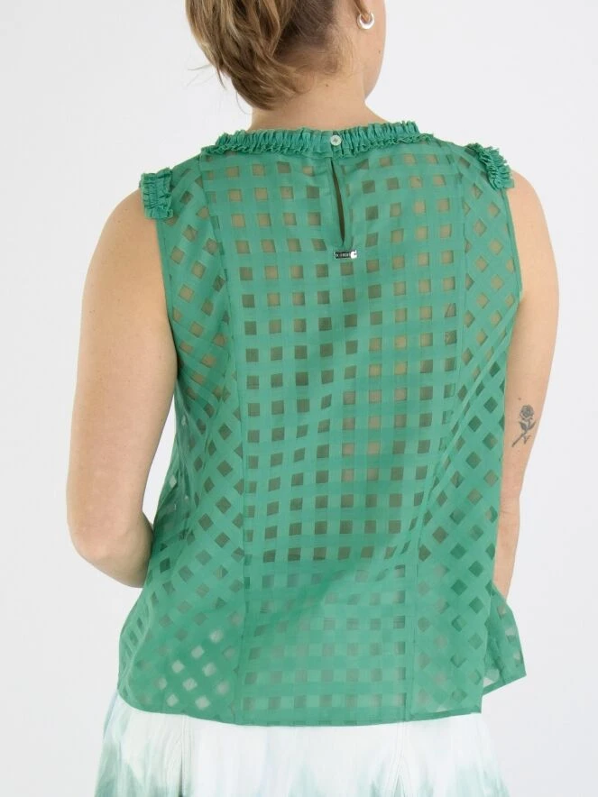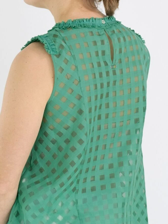 Eine leicht transparente Top von High in einem Blockmuster in Grün. Entlang des Randes des runden Halsausschnitts befindet sich eine fein gefaltete Borte. Vom Halsausschnitt nach unten gibt es an beiden Seiten der Mitte eine Falte. In Taillenhöhe befindet sich an der Vorderseite eine Naht, entlang der der Stoff fein gefaltet ist. Diese Top darf nicht gewaschen werden.