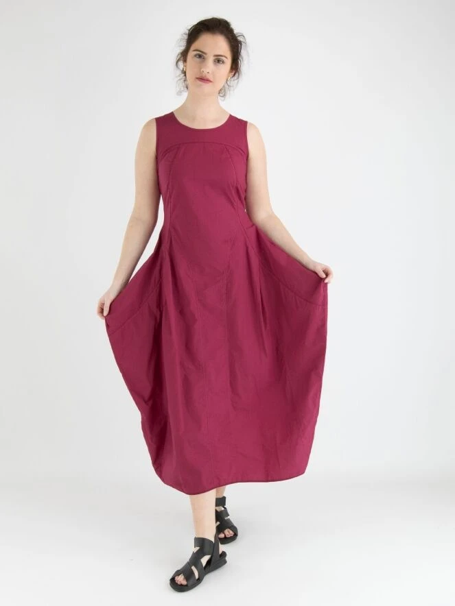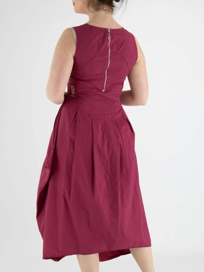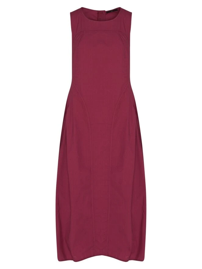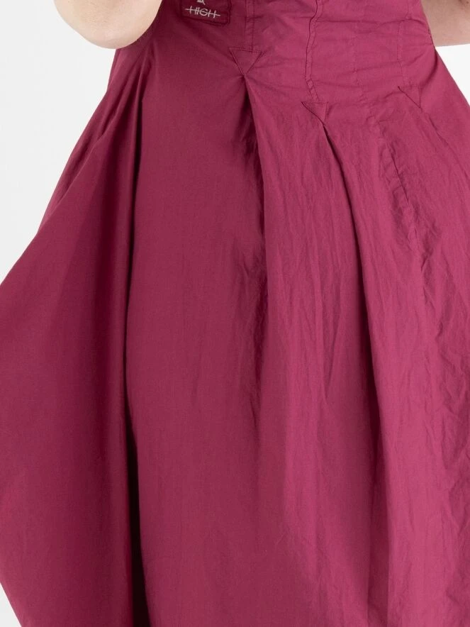 Ein Kleid von High in Himbeerrot. Das Kleid hat einen runden Ausschnitt mit Schulterträgern, die 7 cm breit sind. Ab der Taille fächert das Kleid sich zu einer Ballonform auf, und auf Taillenhöhe befinden sich Taschen. Dieses Kleid sollte per Hand gewaschen werden.