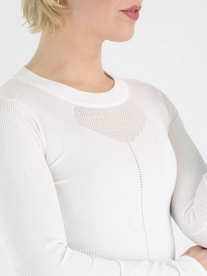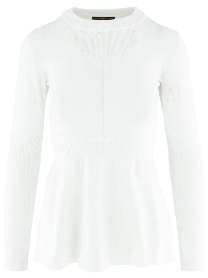 Ein elastischer Pullover von High in Weiß. An der Taille, den Ellenbogen und entlang des Randes des hohen Rundhalsausschnitts befindet sich eine breite fein gerippte Borte. Unter dem Hals und an den Ärmeleinsätzen ist der Stoff fein perforiert. Dieser Pullover kann von Hand gewaschen werden.