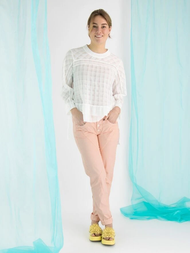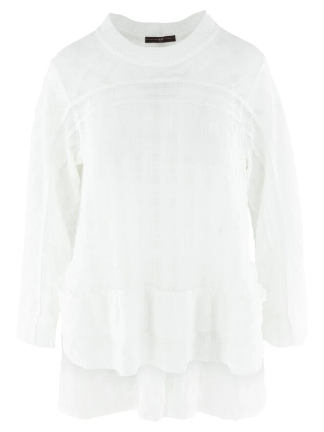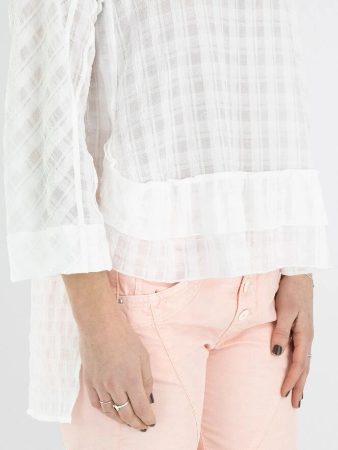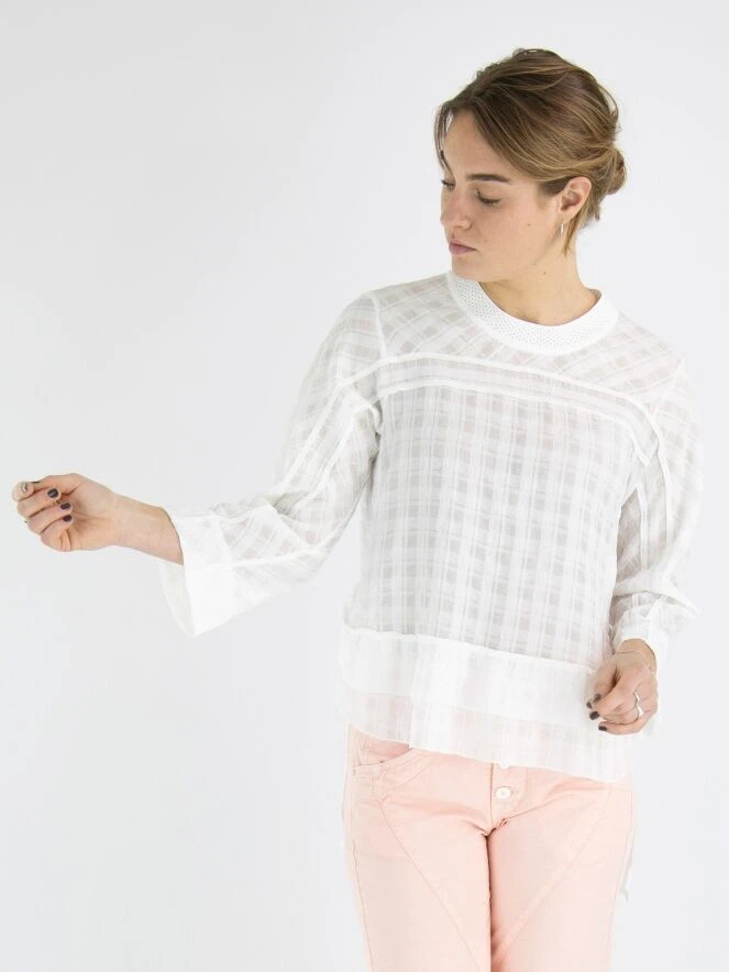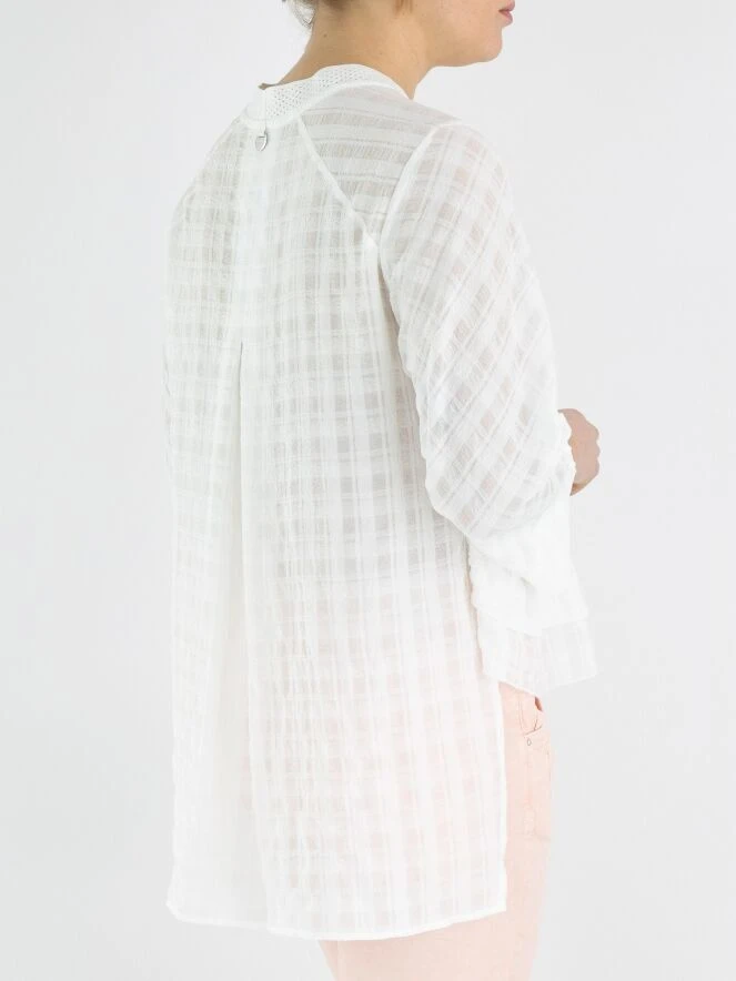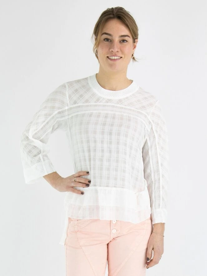 Eine leicht transparente Bluse von High in einem Blockmuster in der Farbe Weiß. Entlang der Kante des hohen Rundhalsausschnitts verläuft eine Paspel, die fein perforiert ist. Auf der Vorderseite befindet sich unten eine doppelt genähte Naht. Die Bluse hat halblange Ärmel und kann mit der Hand gewaschen werden.