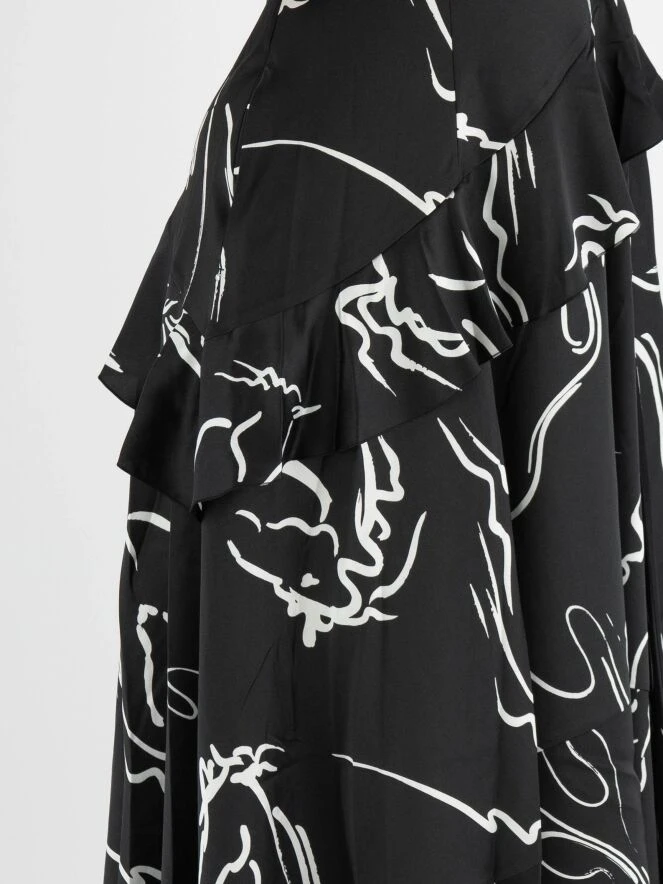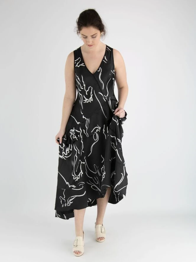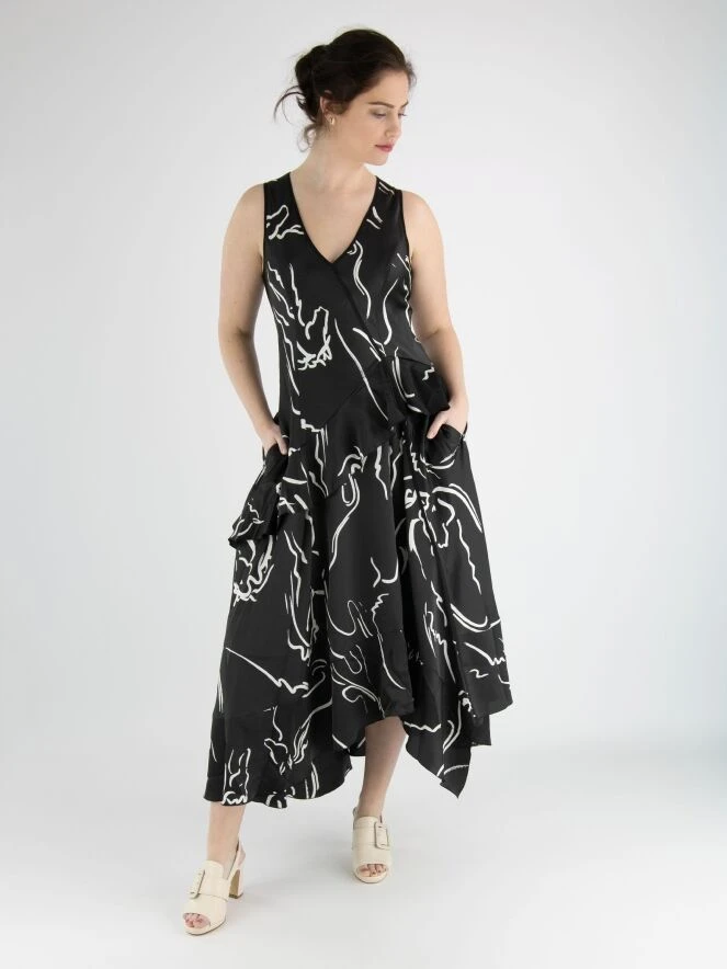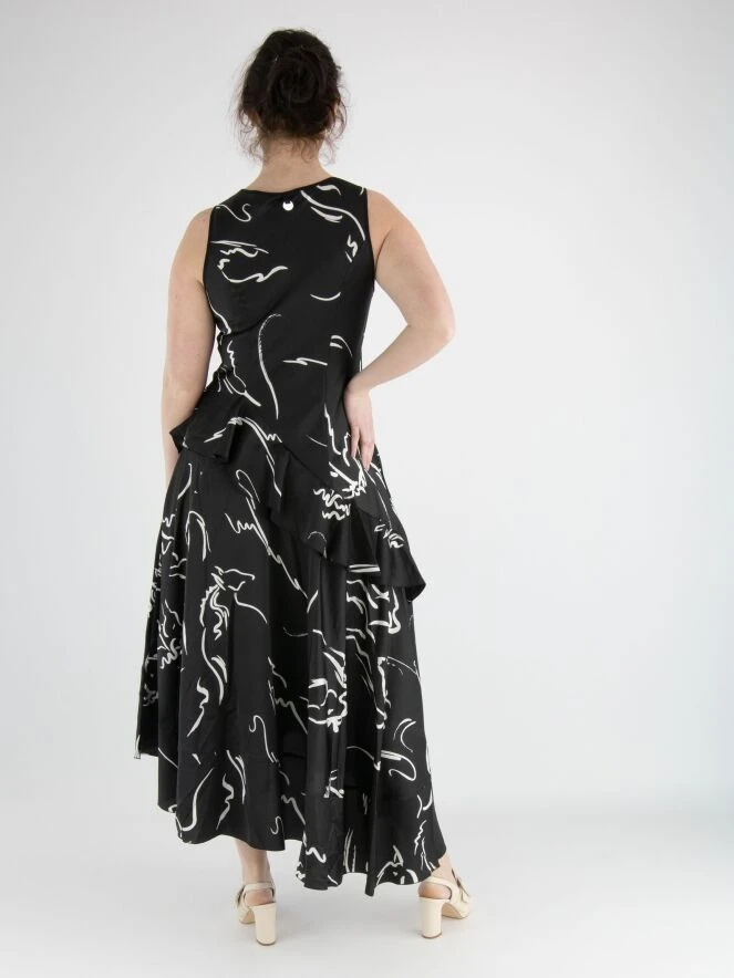 Ein Kleid von High in einem grafischen Druck mit den Farben Schwarz und Weiß. Vom V-Ausschnitt verläuft eine Naht diagonal bis zur Taille. Ab der Taille gibt es eine Rüsche als doppelten Stoff, der diagonal von der linken Seite zur rechten Seite in Kniehöhe verläuft. Das Kleid hat ab der Taille eine A-Linien-Silhouette. Dieses Kleid kann von Hand gewaschen werden.
