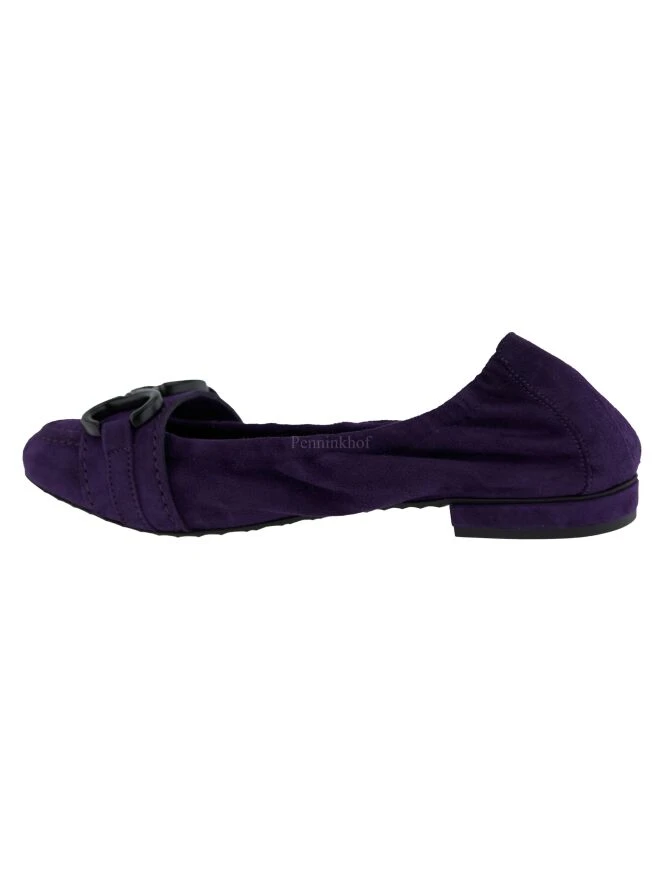 Ein lila Ballerina der Schuhmarke Kennel & Schmenger. Auf dem vorderen Fußteil befindet sich eine mattschwarze Schnalle mit einem dekorativen Herz im Wildleder. In den Rand des Schaftes ist ein Gummiband eingearbeitet.