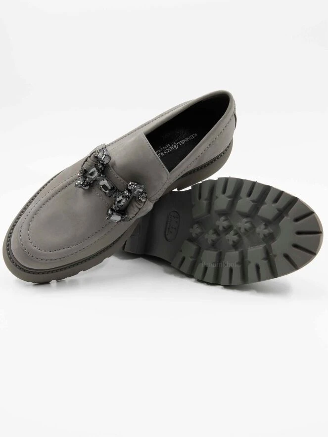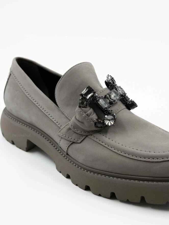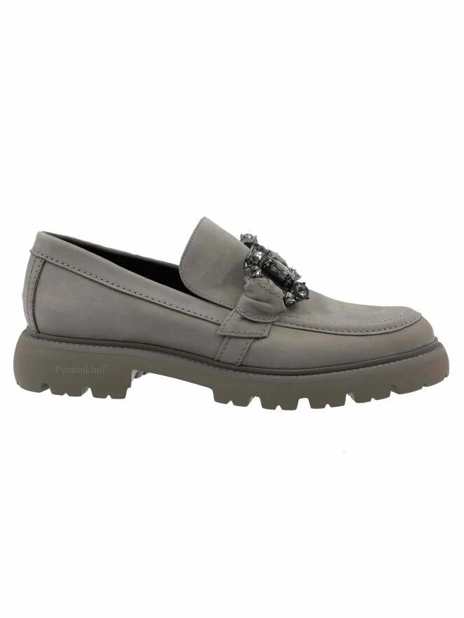 Ein Halbschuh von Kennel & Schmenger in der Farbe grau. Auf dem Vorfuß befindet sich eine dekorative Schnalle mit Strasssteinen in Gebissform. Die graue Sohle ist gerippt. Die Innenseite ist mit Leder gefüttert.