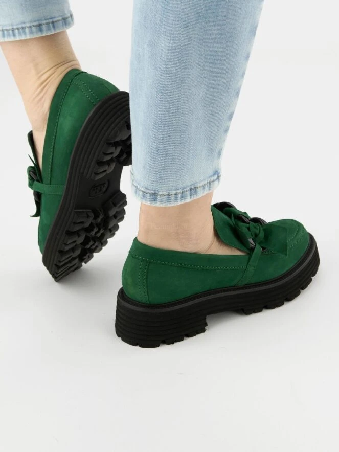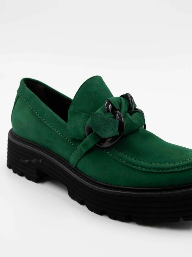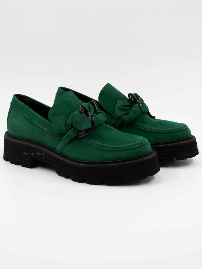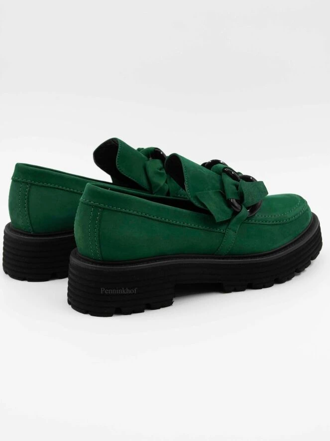 Ein Halbschuh von Kennel & Schmenger in grün. Am Vorderfuß befindet sich ein dekorativer, geknoteter Riemen mit 2 schwarzen Lackschnallen. Die gerippte Sohle ist in der Farbe schwarz.