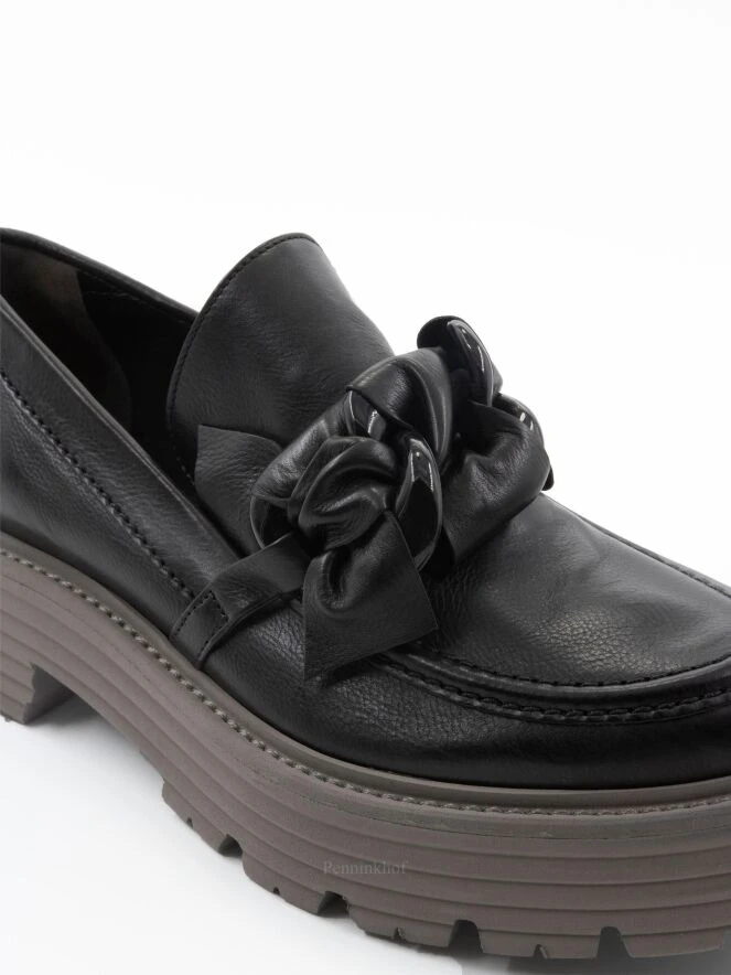 Ein Ristschuh von Kennel & Schmenger in schwarz. Am Vorderfuß befindet sich ein dekorativer Knotenriemen mit 2 schwarzen Lackschnallen. Die geknotete Sohle ist in der Farbe grau.