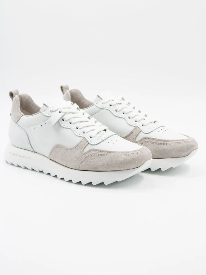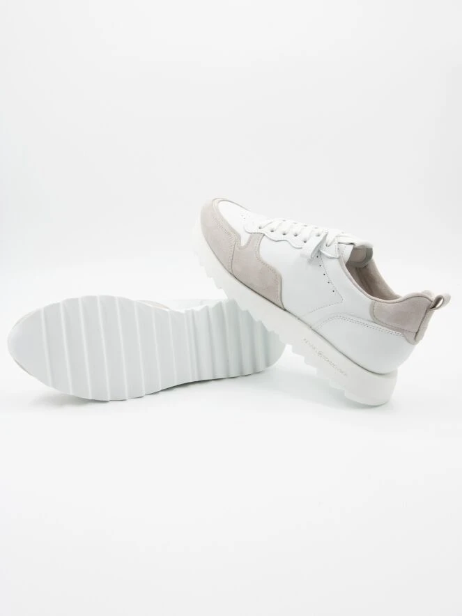 Ein Sneaker von Kennel & Schmenger in Weiß. Entlang des Randes von der Fußspitze zu den Seiten hin befindet sich ein breiter Teil aus einem hellgrauen Camoscio-Wildleder, der sich bis zur Ferse und entlang des inneren Randes des Schafts erstreckt. Die weiße Sohle ist stark gezackt, und das Innere ist mit Leder gefüttert.