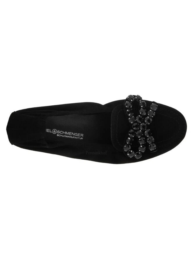 Ein schwarzer Ballerina der Schuhmarke Kennel & Schmenger. Auf dem vorderen Fußteil befindet sich eine dekorative Schleife mit Kunstdiamanten.
