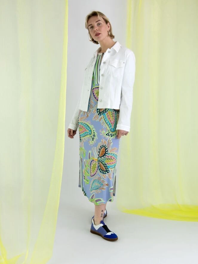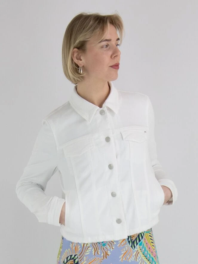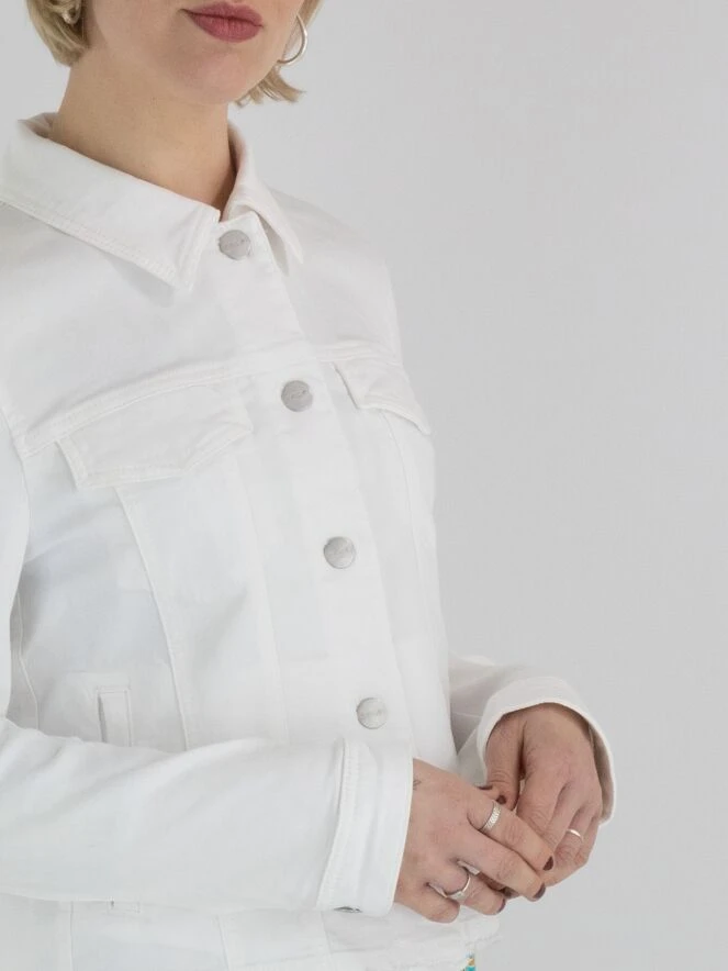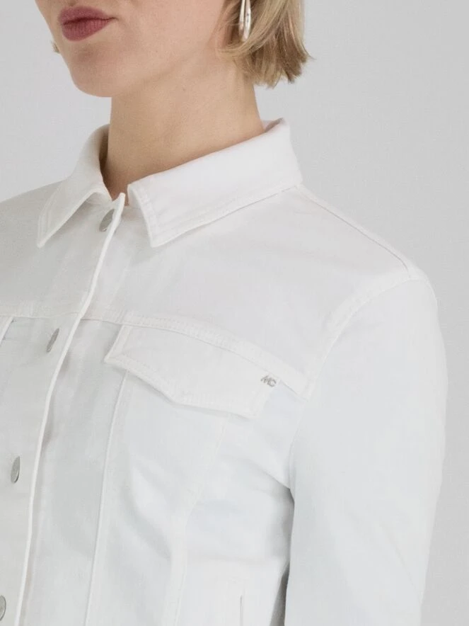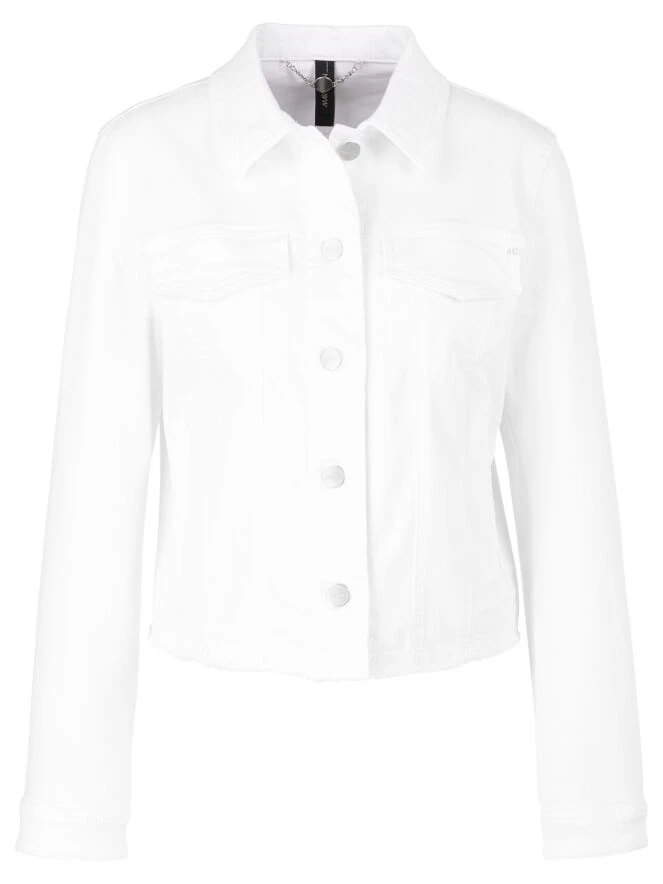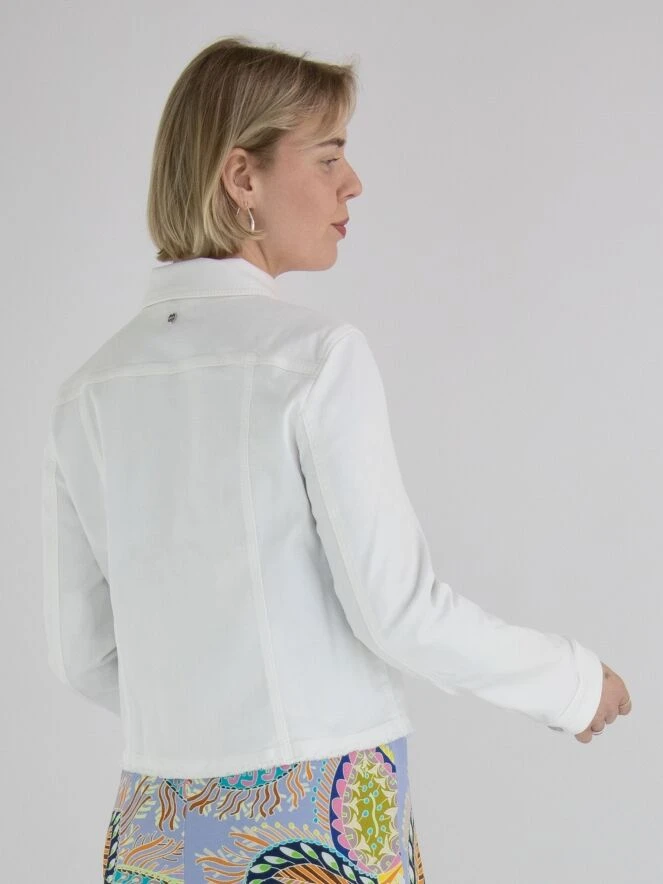 Ein weißer Jeans-Blazer von Marc Cain. Er verfügt über einen Knopfverschluss mit 5 Knöpfen und der untere Rand des Stoffes ist fein ausgefranst. Dieser Blazer kann bei 30 Grad gewaschen werden.