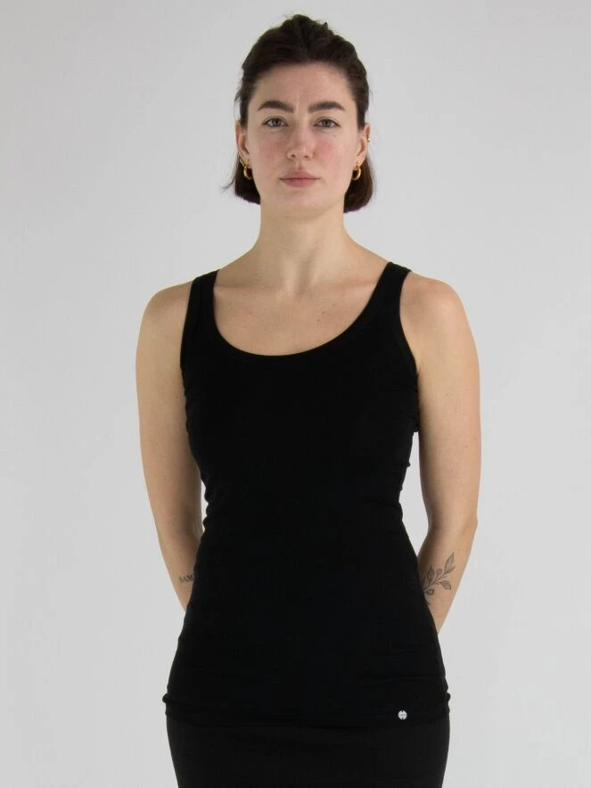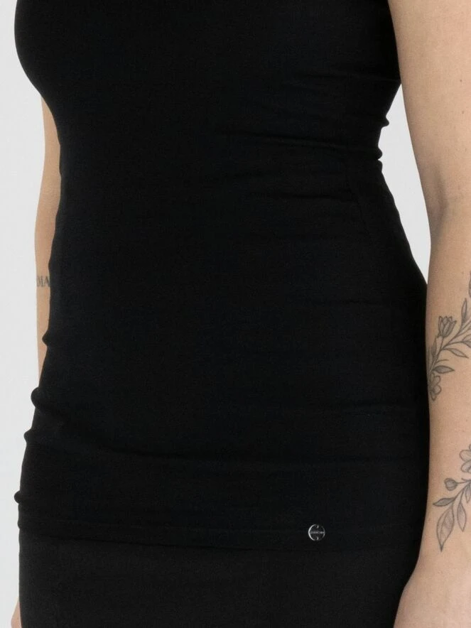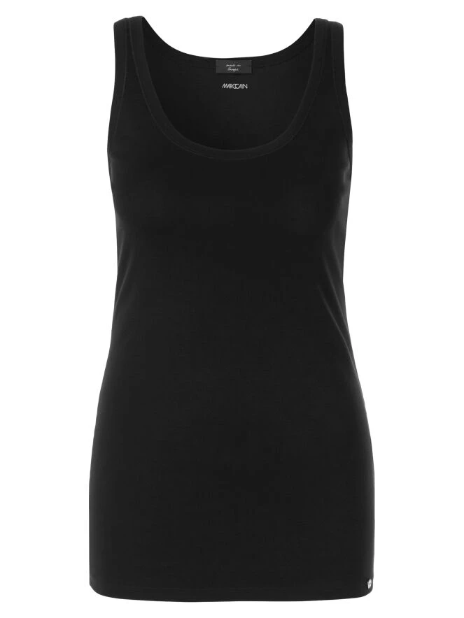 Ein Top von Marc Cain in Schwarz. Das Top hat einen großzügigen Rundhalsausschnitt, und die Träger sind 3 cm breit. Dieses Top kann bei 30 Grad gewaschen werden.