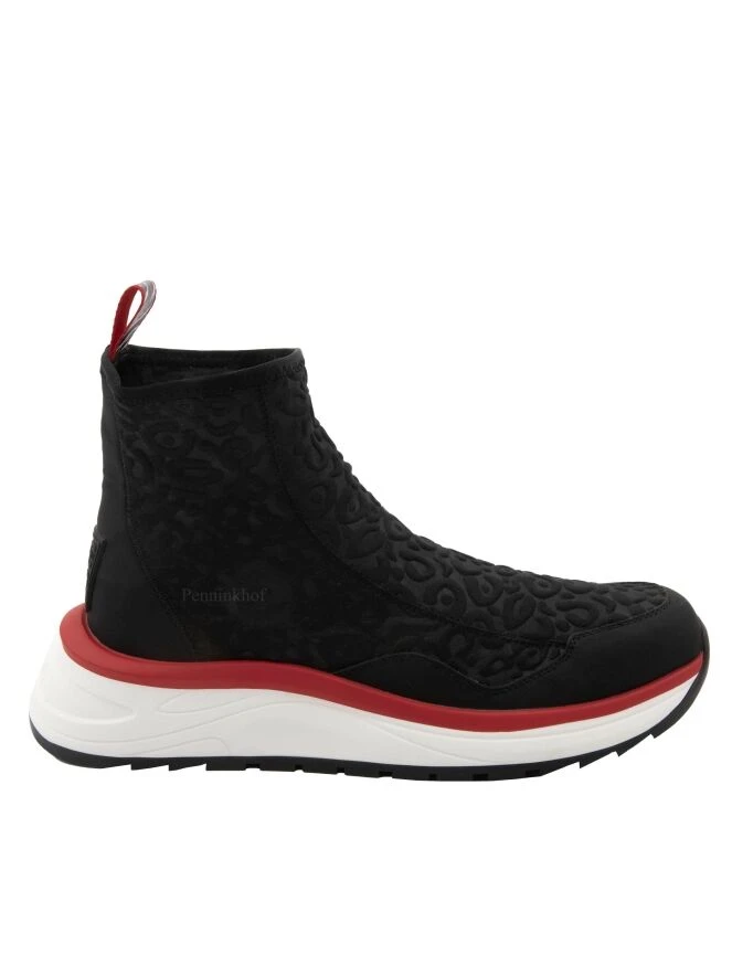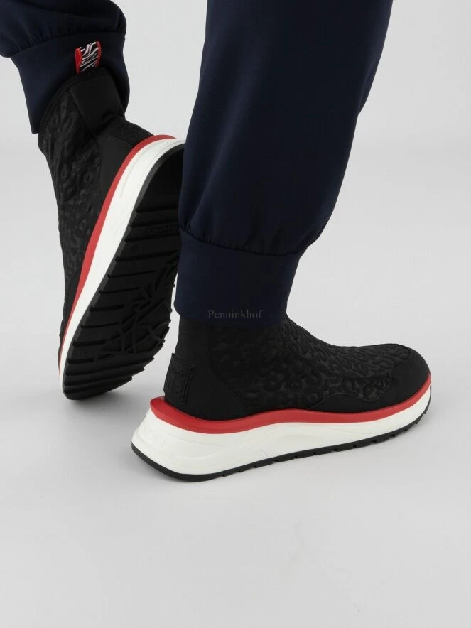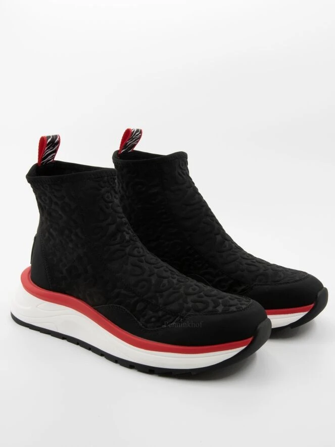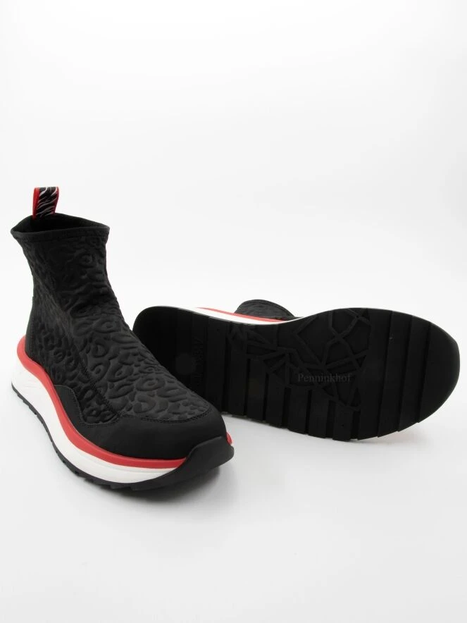 Marc Cain kurzer Schlupfstiefel in Schwarz aus einem elastischen, gesmokten Stoff. Die Sohle ist in weißer Farbe mit roter Zierleiste gehalten. Die Ferse und die Zehenkappe sind aus weichem Leder.