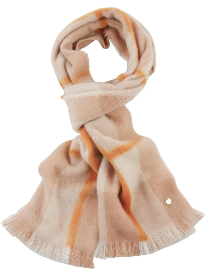 Marc Cain Schal in einem Karomuster mit den Farben Kamel, Sand und Orange. Die Enden des Schals sind fein ausgefranst. Dieser Schal sollte nicht gewaschen werden.