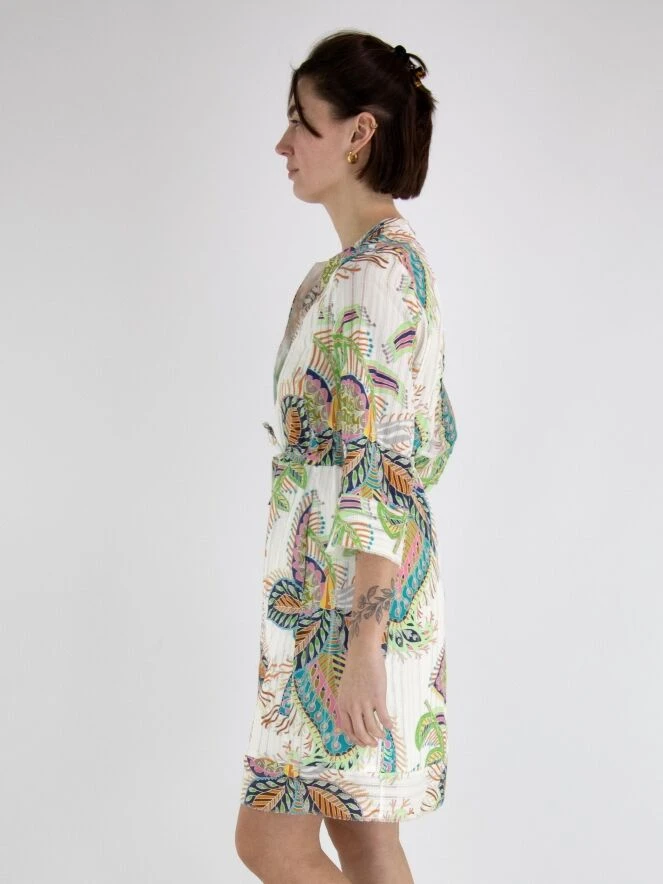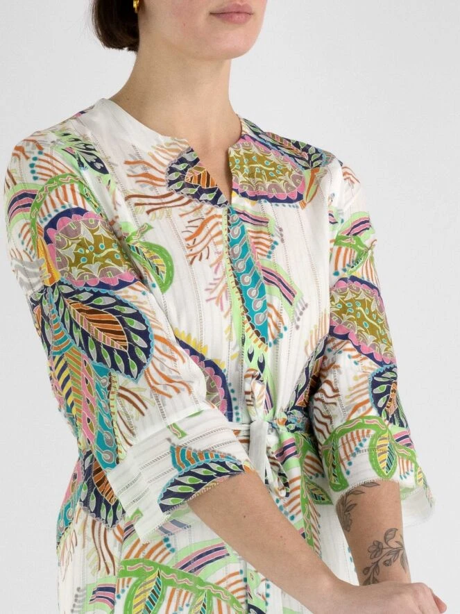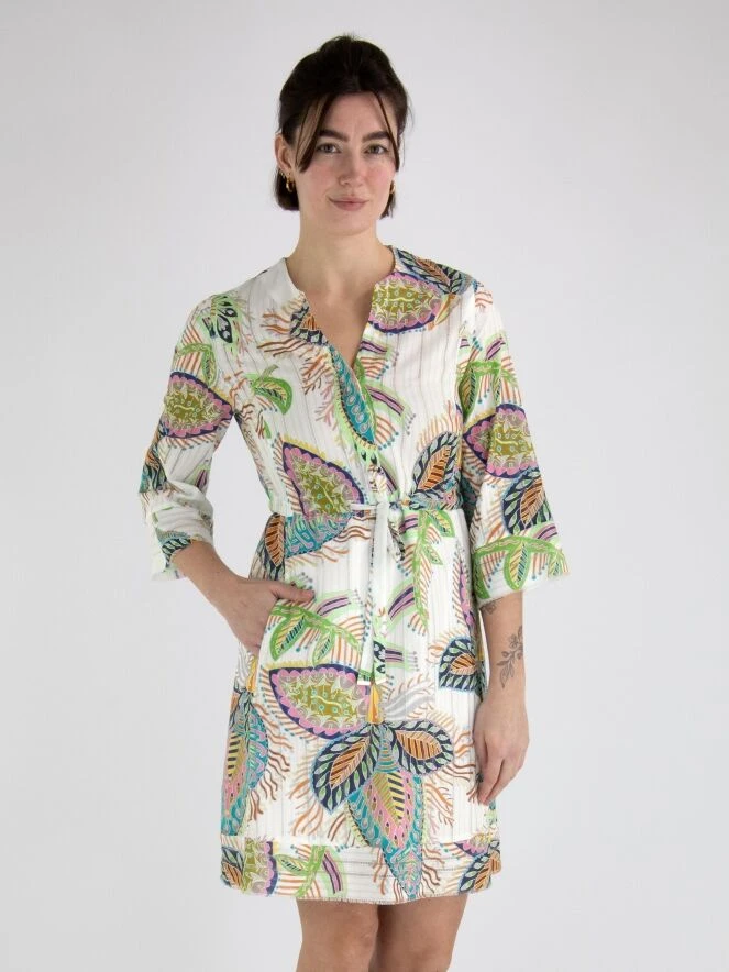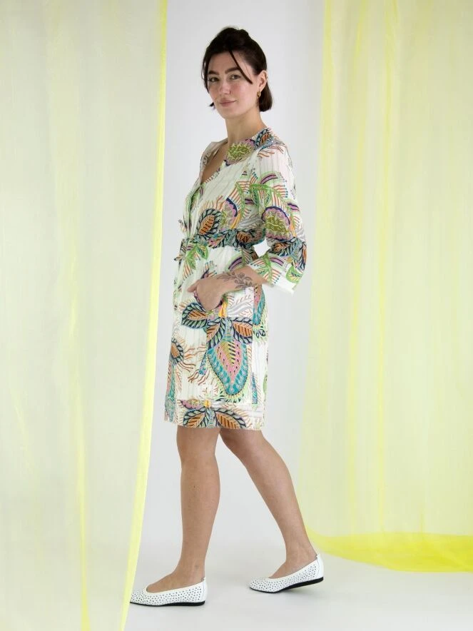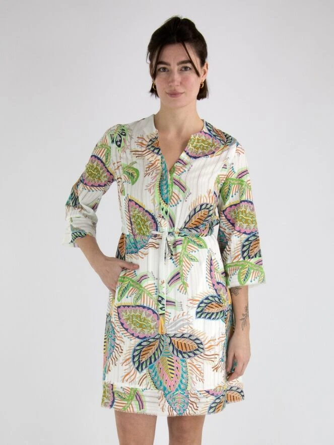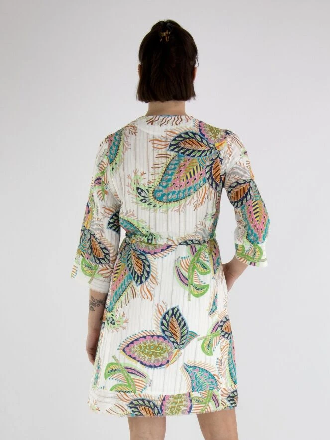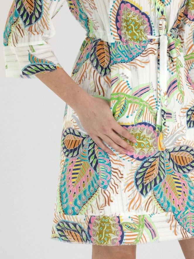 Ein Kleid von Marc Cain mit einem mehrfarbigen Blattmuster auf weißem Hintergrund. Vertikale Lochlinien sind in den Stoff eingearbeitet. In der Taille befindet sich ein Kordelzug aus demselben Stoff wie das Kleid, in einer Tunnelverarbeitung. Das Kleid hat halblange Ärmel und ist ab der Taille gefüttert. Dieses Kleid kann bei 30 Grad gewaschen werden.