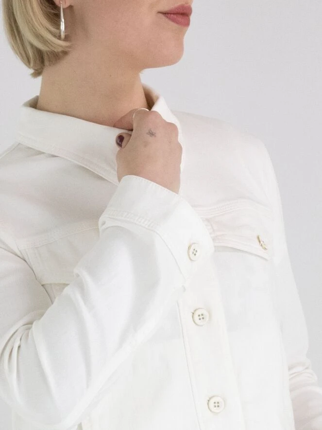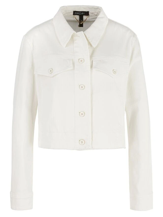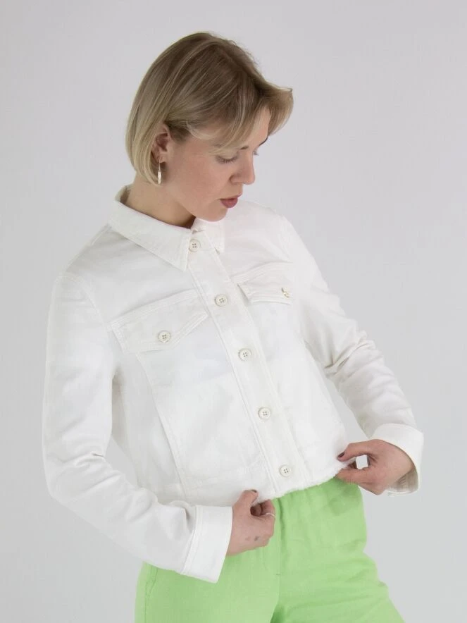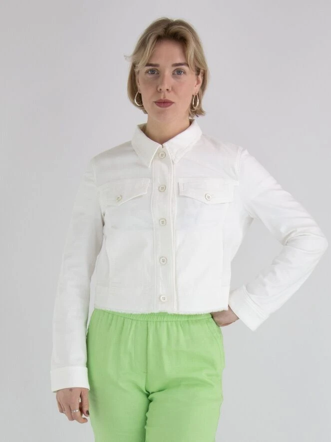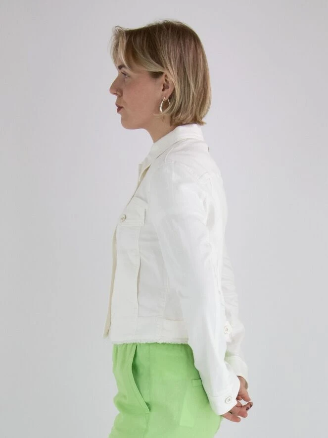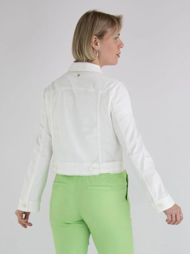 Ein kurzer Jeansblazer von Marc Cain in cremefarbener Farbe. Der Blazer hat einen Verschluss mit 5 Knöpfen, und der Rand am unteren Ende ist fein ausgefranst. Dieser Blazer kann bei 30 Grad gewaschen werden.